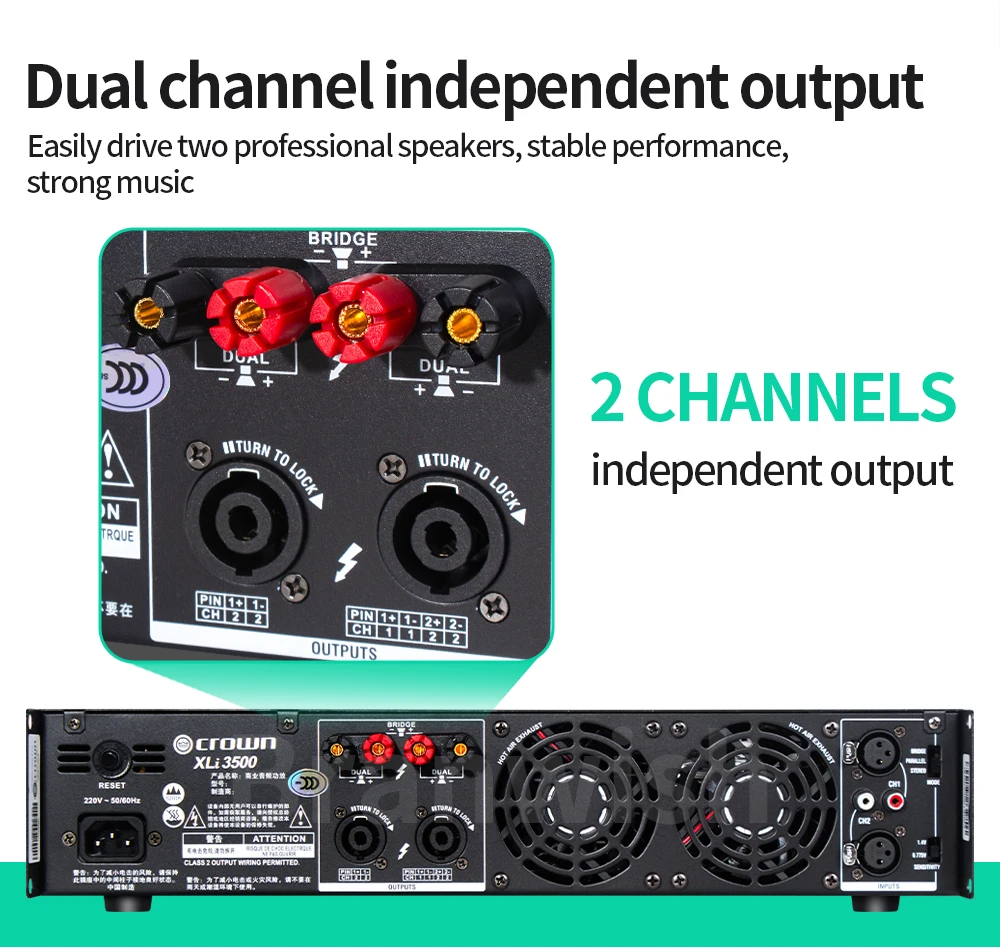 No hay dos plataformas iguales, por lo que Crown equipó sus amplificadores XLi (incluidos el XLi 3500) con todas las conexiones populares que exigen ingenieros de sonido en vivo serios.En el lado de entrada, el XLi 3500 ofrece conectores XLR balanceados y RCA no balanceados, ya que se adaptan tanto a mezcladores profesionales como a sistemas de DJ.Por el contrario, tanto los postes de enlace de baja tecnología como los modernos conectores hablarON le permiten conectar cualquier variedad de altavoces PA pasivos.