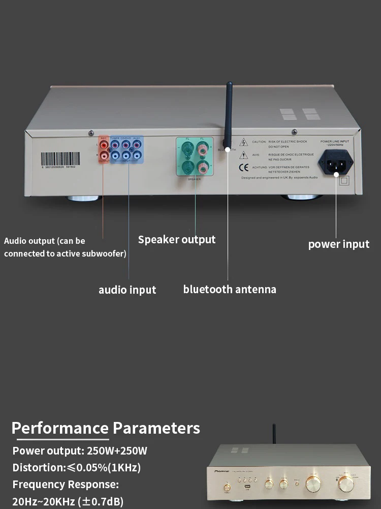 Amplificador de potencia de fiebre de alta potencia de 250W + 250W, amplificador de altavoz Auido pre-etapa, cine en casa, Bluetooth 4,0, compatible con altavoces de 4 a 8 Ω