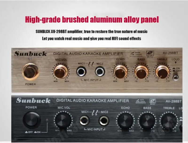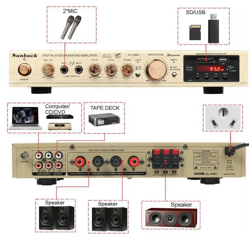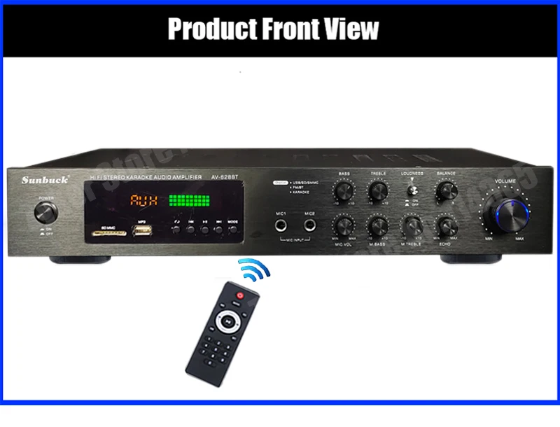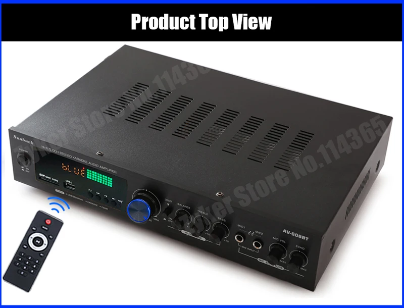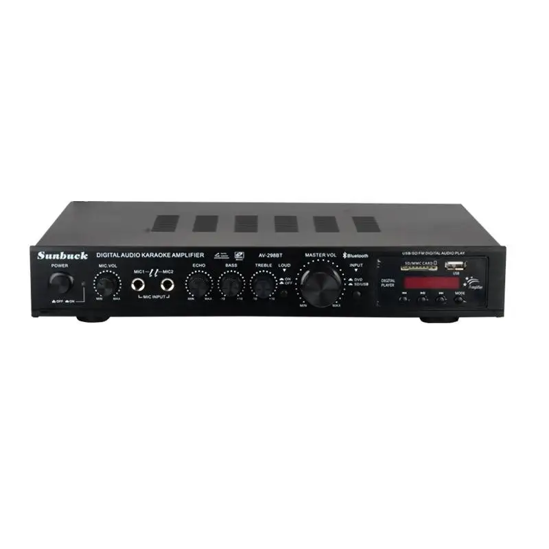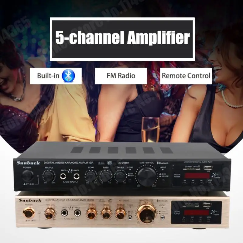 1. Este amplificador es un amplificador con sonido surround multifuncional que es adecuado para Hi-Fi, cine en casa o para eventos pequeños y karaoke.2. Las entradas RCA estéreo y la entrada Jack se pueden conectar con todo tipo de equipos de audio, como reproductores de MP3, reproductores de DVD y ordenadores, y pueden enviar el sonido a un total de 5 altavoces.3. Como una adición útil a su función de alta fidelidad y cine en casa, también cuenta con dos entradas de micrófono en el panel frontal que le permiten entretenerse en eventos PA, fiestas de karaoke o reuniones.4. El dispositivo también ofrece un receptor de radio integrado para sintonizar todas sus estaciones de radio favoritas.Característica:1.5.0 amplificador de conexiones de altavoz con radio2,1120 W máx. Rendimiento general3. Volumen del micrófono ajustable4. Se suministra con control remoto5. Controles iluminados en azul6. Pantalla LED7. Efecto de retardo de micrófono ajustable8. Admite radio FM/AM.Especificación:-- Potencia máxima: 500W + 500W + 120W-- Voltaje nominal: 110V/220V-- RMS:250W + 250W + 120W-Tasa de distorsión: 0.01%-- Impedancia: 4 a 16 Ohm-- Canal: 5 canales de sonido-- Tipo de amplificador de potencia: amplificador de potencia AV-- HiFi: soporte-- Bluetooth Visión: 5,0-- Color: negro-- Material: aleación de aluminioEmpaquetado incluido:1 AMPLIFICADOR DE POTENCIA DE AUDIO 628BT