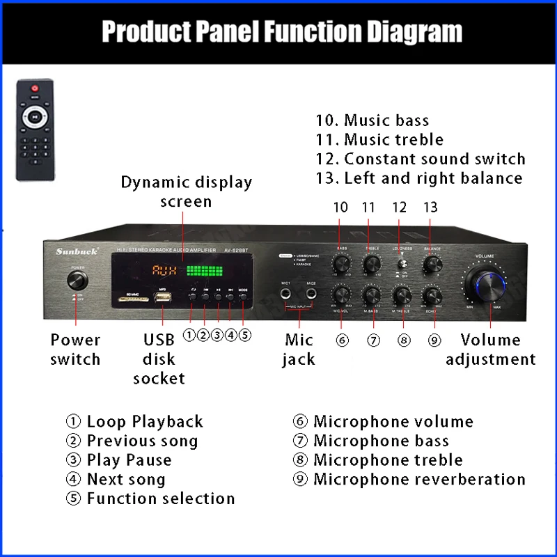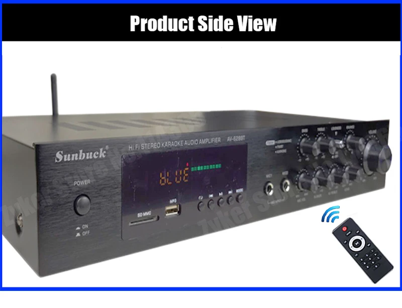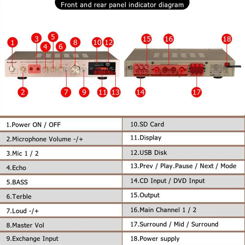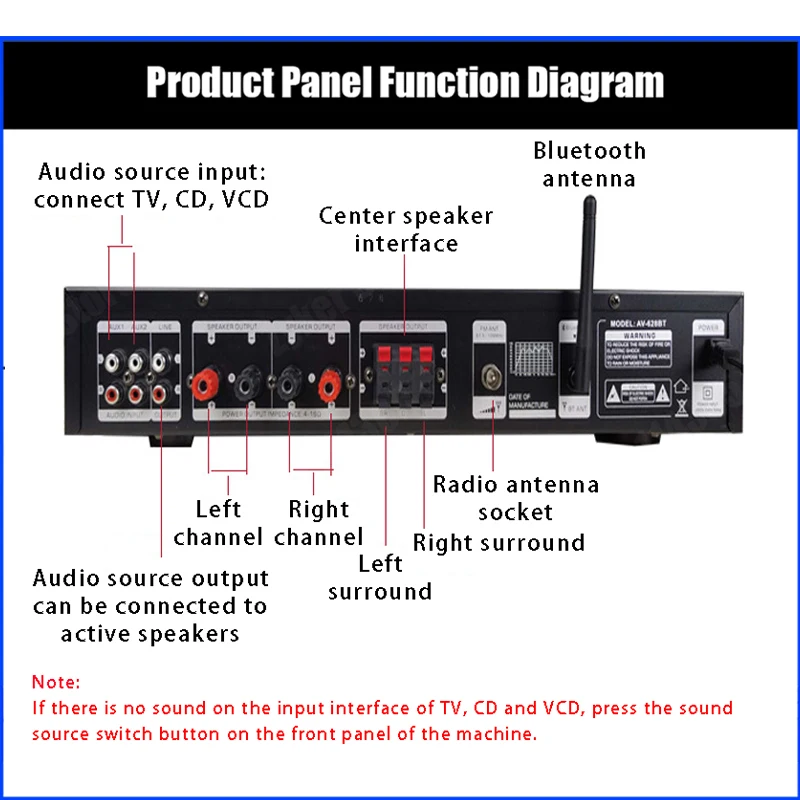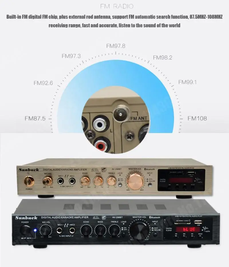 1. Este amplificador es un amplificador con sonido surround multifuncional que es adecuado para Hi-Fi, cine en casa o para eventos pequeños y karaoke.2. Las entradas RCA estéreo y la entrada Jack se pueden conectar con todo tipo de equipos de audio, como reproductores de MP3, reproductores de DVD y ordenadores, y pueden enviar el sonido a un total de 5 altavoces.3. Como una adición útil a su función de alta fidelidad y cine en casa, también cuenta con dos entradas de micrófono en el panel frontal que le permiten entretenerse en eventos PA, fiestas de karaoke o reuniones.4. El dispositivo también ofrece un receptor de radio integrado para sintonizar todas sus estaciones de radio favoritas.Característica:1.5.0 amplificador de conexiones de altavoz con radio2,1120 W máx. Rendimiento general3. Volumen del micrófono ajustable4. Se suministra con control remoto5. Controles iluminados en azul6. Pantalla LED7. Efecto de retardo de micrófono ajustable8. Admite radio FM/AM.Especificación:-- Potencia máxima: 500W + 500W + 120W-- Voltaje nominal: 110V/220V-- RMS:250W + 250W + 120W-Tasa de distorsión: 0.01%-- Impedancia: 4 a 16 Ohm-- Canal: 5 canales de sonido-- Tipo de amplificador de potencia: amplificador de potencia AV-- HiFi: soporte-- Bluetooth Visión: 5,0-- Color: negro-- Material: aleación de aluminioEmpaquetado incluido:1 AMPLIFICADOR DE POTENCIA DE AUDIO 628BT