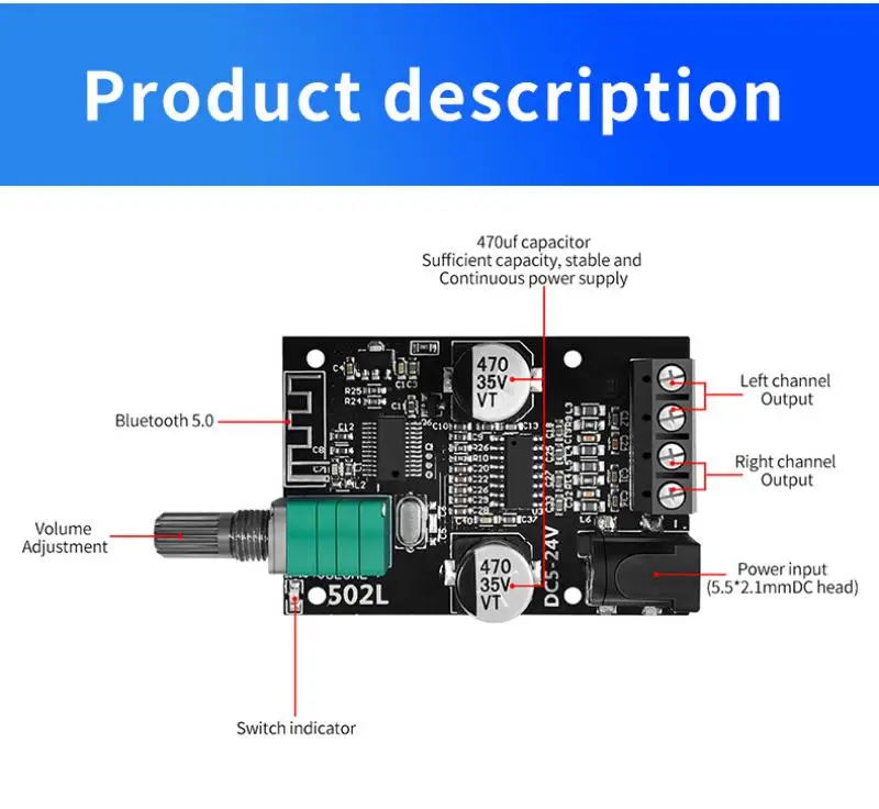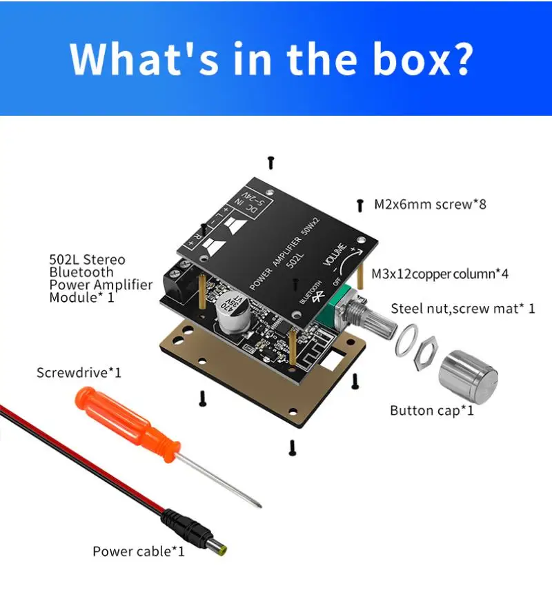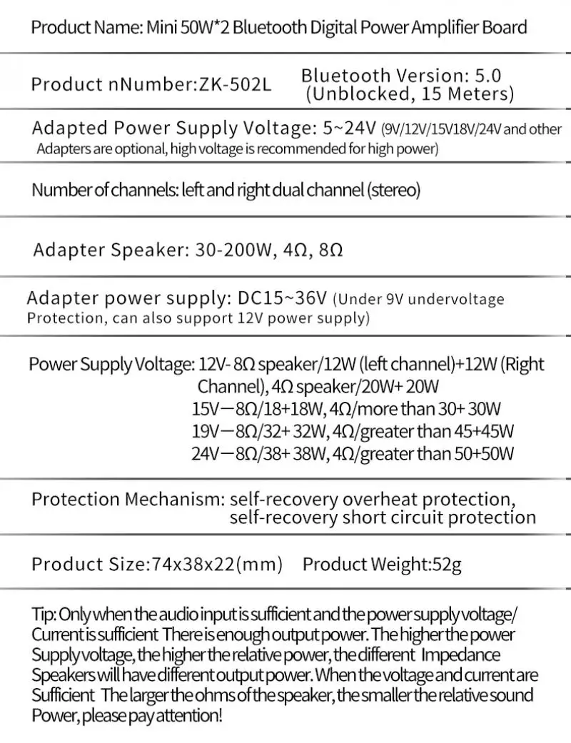 Se recomienda utilizar una fuente de alimentación de 18V19V24V con una corriente de más de 3A. Si solo tiene una fuente de alimentación 9V12V o 1A 2A, también se puede usar, pero la potencia es baja. Tenga en cuenta que el volumen puede estar distorsionado y afectar la calidad del sonido.