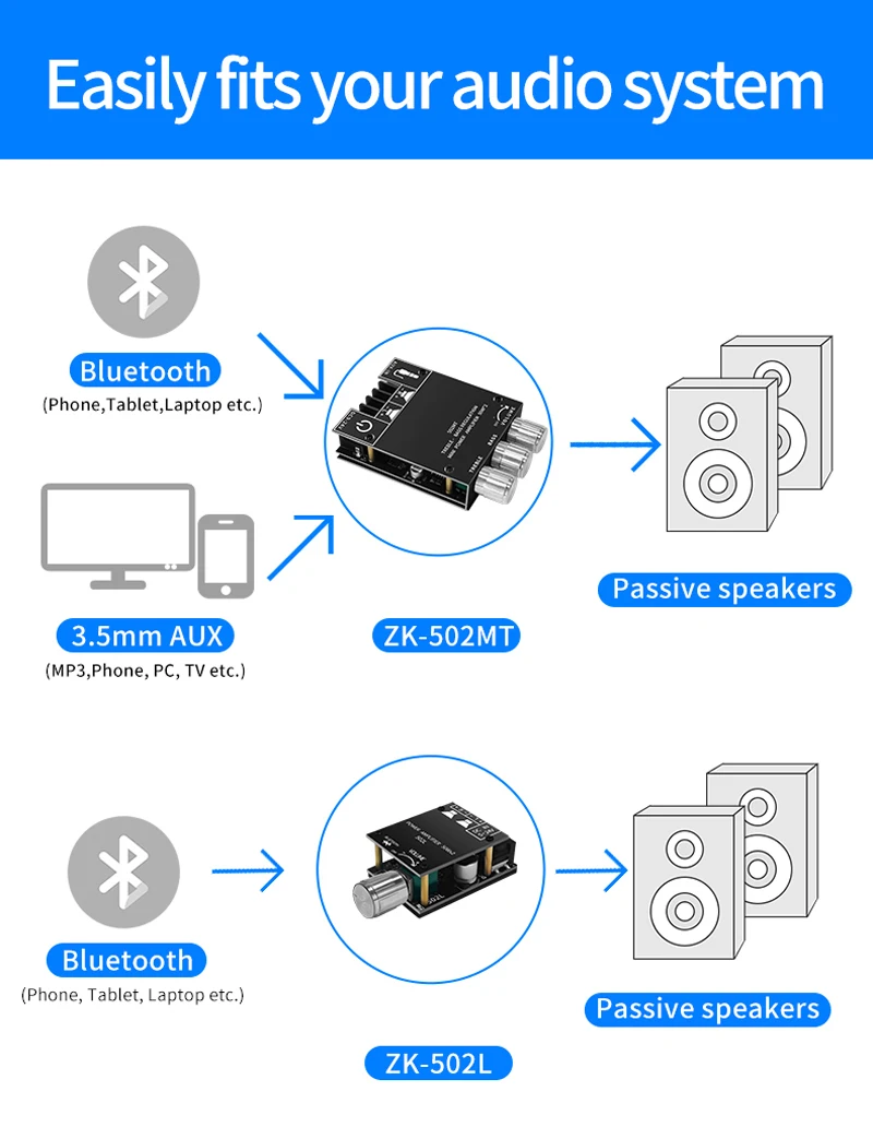 El enlace contiene cuatro modelos diferentes de placas amplificadoras:ZK-502MT/ZK-502L.