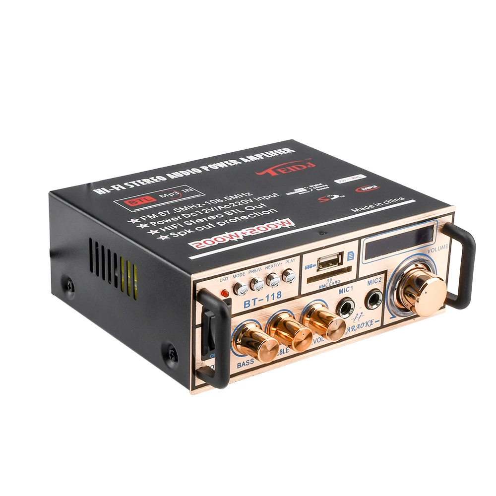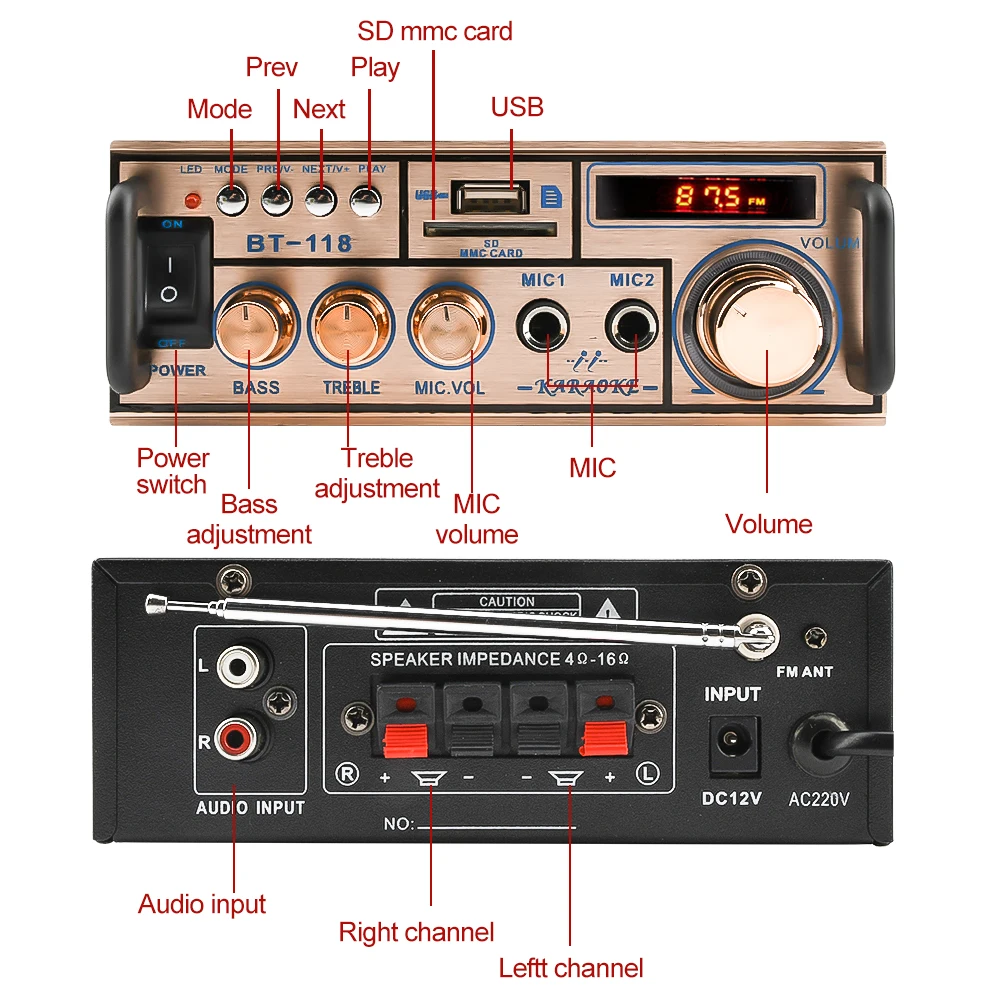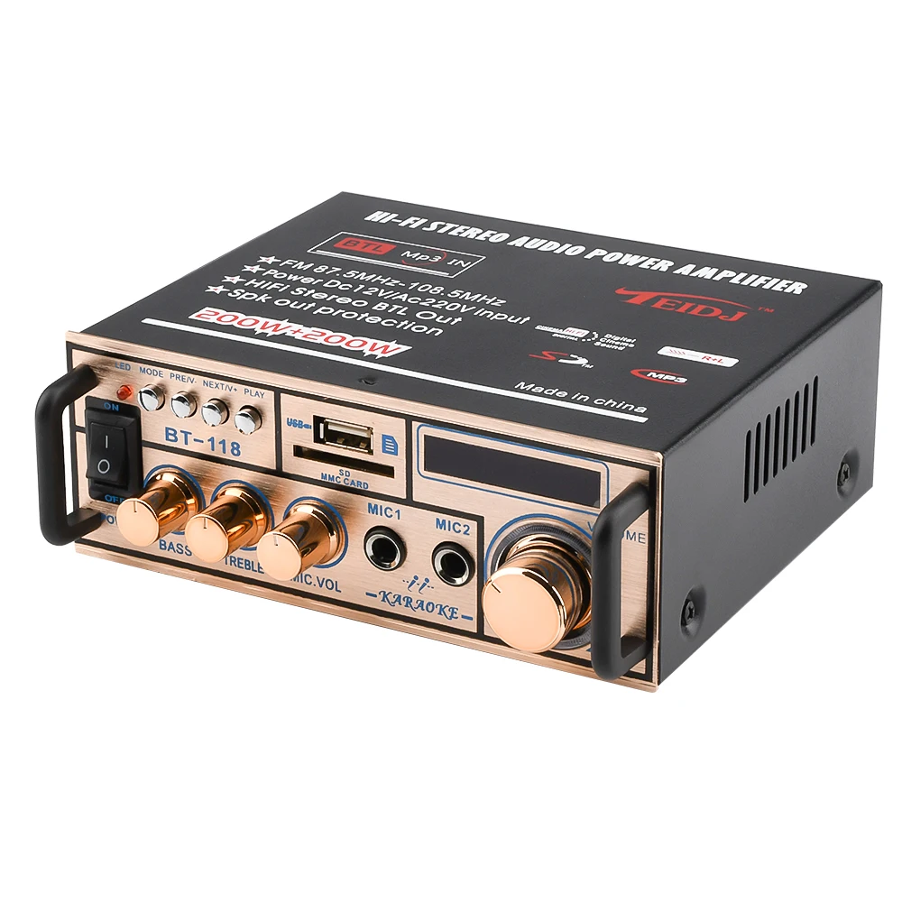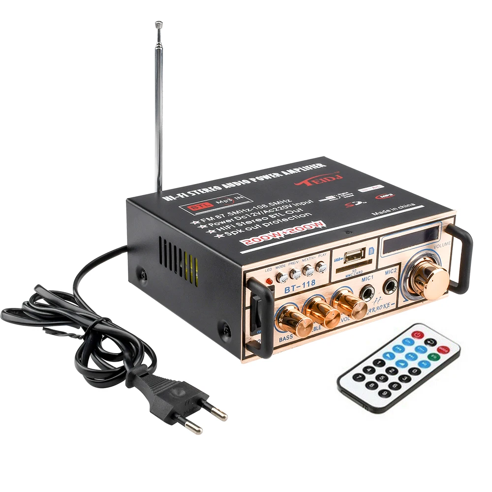 Mini amplificador de potencia de audio digital HIFI Bluetooth. Pantalla LCD incorporada con función de retroiluminación. Admite tarjeta SD, disco U, reproducción de formato MP3, admite conexión inalámbrica Bluetooth. Compatible con Radio Estéreo FM. Dos ranuras de entrada de micrófono, sistema de karaoke en casa o coche. Con Control de agudos, graves y volumen, es muy fácil de usar. La baja distorsión proporciona un sonido más claro, más fuerte y más potente. Dos salidas de canal principal. Con función de control remoto. Entrada de alimentación CC/CA, adecuada para el hogar o el coche. Especificación: Modelo: BT-118 Voltaje de entrada: CA 220V / DC12V (coche) Enchufe: enchufe de la UE Bluetooth: soporte Potencia de salida: 80W + 80W Potencia máxima: 200W + 200W Canal: 2 canales Impedancia de carga: 4-16Ω Relación señal-ruido: 92 dB Frecuencia FM: 87,5-108MHz Tasa de distorsión: 0.05% Frecuencia: 10Hz-20KHz Sensibilidad: 0.25mV-220mV Fuente de alimentación RC: Batería CR2052 (incorporada) Dimensiones: aproximadamente 15,8x14,5x5,7 cm/7,06x5,9x2,1 pulgadas Paquete incluido: 1 amplificador de audio 1 control remoto (sin batería CR2032)