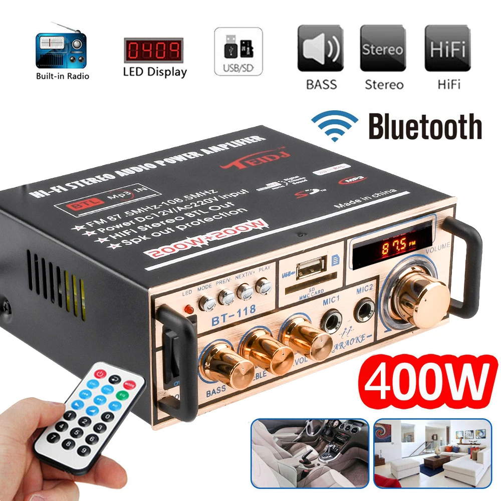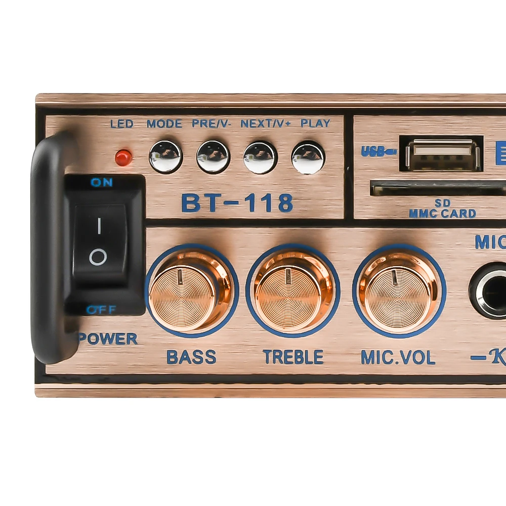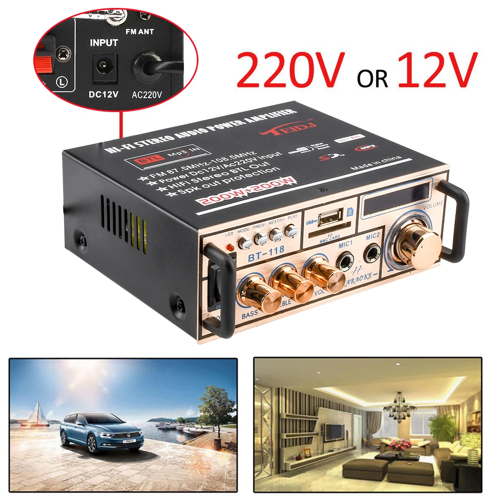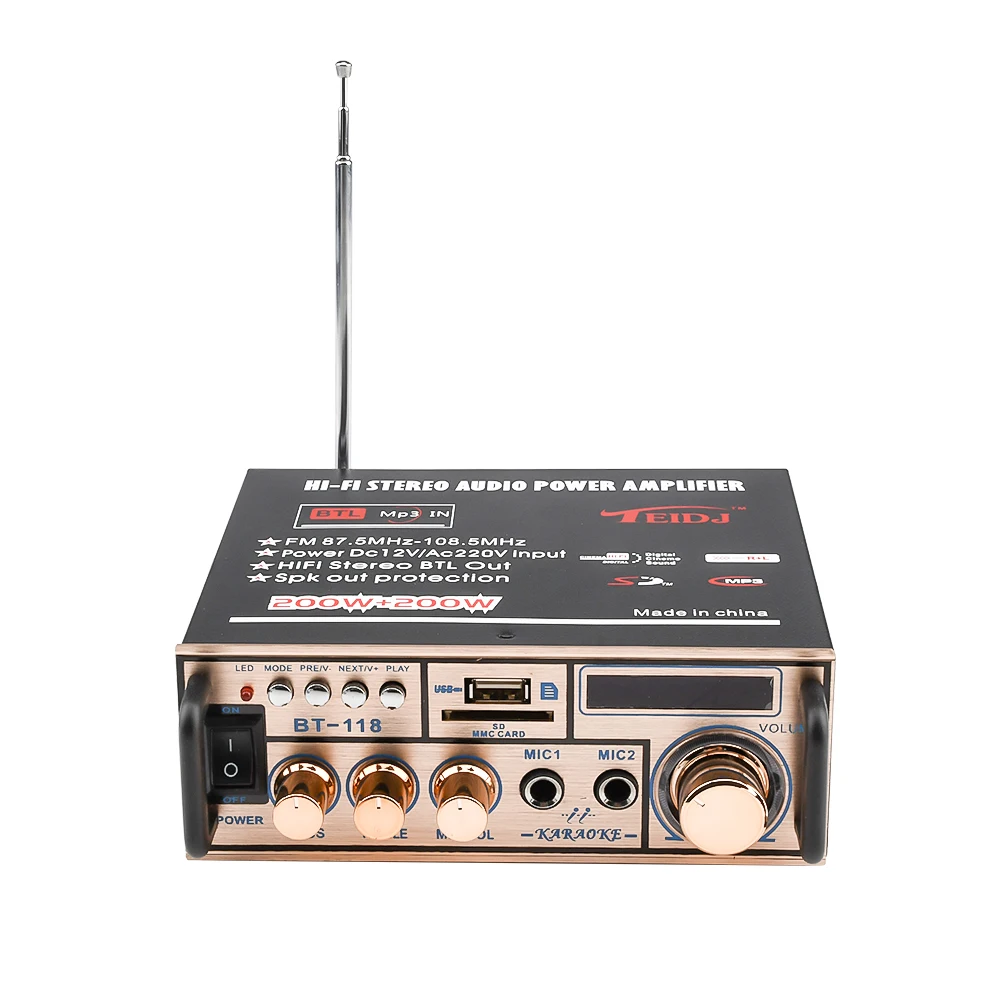 Mini amplificador de potencia de audio digital HIFI Bluetooth. Pantalla LCD incorporada con función de retroiluminación. Admite tarjeta SD, disco U, reproducción de formato MP3, admite conexión inalámbrica Bluetooth. Compatible con Radio Estéreo FM. Dos ranuras de entrada de micrófono, sistema de karaoke en casa o coche. Con Control de agudos, graves y volumen, es muy fácil de usar. La baja distorsión proporciona un sonido más claro, más fuerte y más potente. Dos salidas de canal principal. Con función de control remoto. Entrada de alimentación CC/CA, adecuada para el hogar o el coche. Especificación: Modelo: BT-118 Voltaje de entrada: CA 220V / DC12V (coche) Enchufe: enchufe de la UE Bluetooth: soporte Potencia de salida: 80W + 80W Potencia máxima: 200W + 200W Canal: 2 canales Impedancia de carga: 4-16Ω Relación señal-ruido: 92 dB Frecuencia FM: 87,5-108MHz Tasa de distorsión: 0.05% Frecuencia: 10Hz-20KHz Sensibilidad: 0.25mV-220mV Fuente de alimentación RC: Batería CR2052 (incorporada) Dimensiones: aproximadamente 15,8x14,5x5,7 cm/7,06x5,9x2,1 pulgadas Paquete incluido: 1 amplificador de audio 1 control remoto (sin batería CR2032)