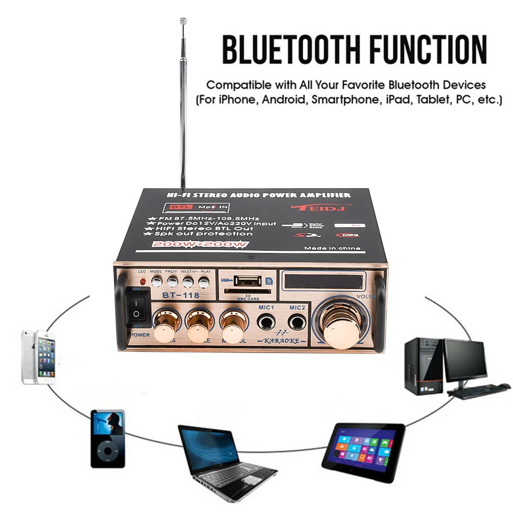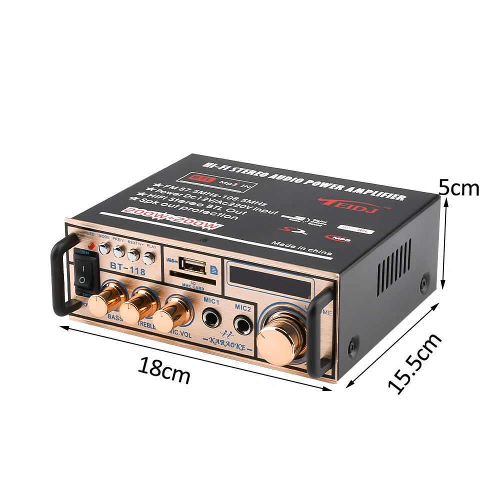 Mini amplificador de potencia de audio digital HIFI Bluetooth. Pantalla LCD incorporada con función de retroiluminación. Admite tarjeta SD, disco U, reproducción de formato MP3, admite conexión inalámbrica Bluetooth. Compatible con Radio Estéreo FM. Dos ranuras de entrada de micrófono, sistema de karaoke en casa o coche. Con Control de agudos, graves y volumen, es muy fácil de usar. La baja distorsión proporciona un sonido más claro, más fuerte y más potente. Dos salidas de canal principal. Con función de control remoto. Entrada de alimentación CC/CA, adecuada para el hogar o el coche. Especificación: Modelo: BT-118 Voltaje de entrada: CA 220V / DC12V (coche) Enchufe: enchufe de la UE Bluetooth: soporte Potencia de salida: 80W + 80W Potencia máxima: 200W + 200W Canal: 2 canales Impedancia de carga: 4-16Ω Relación señal-ruido: 92 dB Frecuencia FM: 87,5-108MHz Tasa de distorsión: 0.05% Frecuencia: 10Hz-20KHz Sensibilidad: 0.25mV-220mV Fuente de alimentación RC: Batería CR2052 (incorporada) Dimensiones: aproximadamente 15,8x14,5x5,7 cm/7,06x5,9x2,1 pulgadas Paquete incluido: 1 amplificador de audio 1 control remoto (sin batería CR2032)