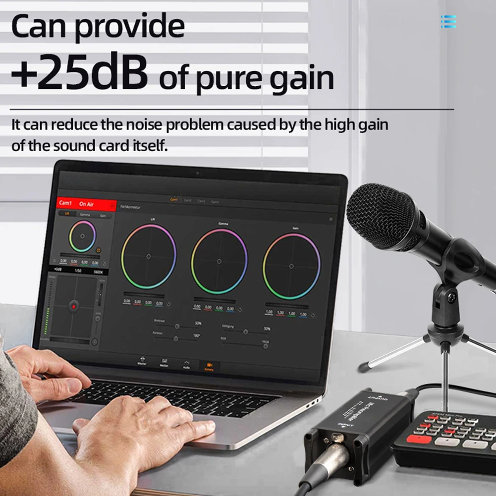 1.Potente ganancia de +25 dB:Este preamplificador de micrófono proporciona una ganancia pura de +25 dB, lo que le permite amplificar su audio sin comprometer la calidad del sonido.Mejora eficazmente sus grabaciones al tiempo que reduce el ruido causado por una ganancia excesiva de su tarjeta de sonido.