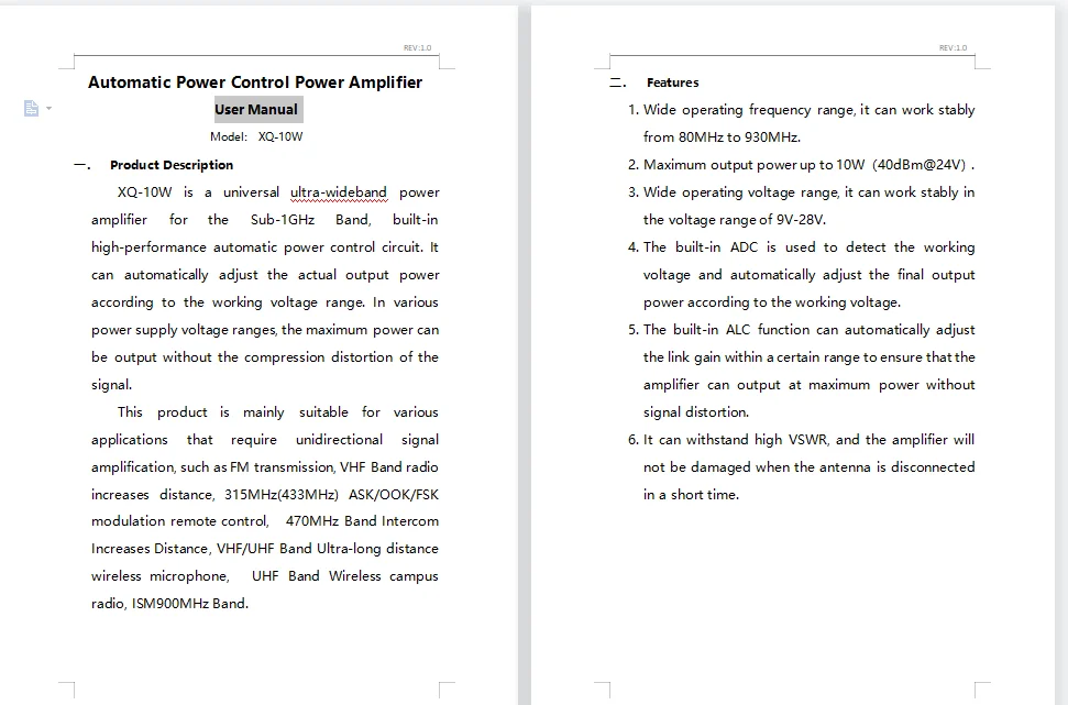 Ámbito de aplicaciónSe utiliza principalmente para varias ocasiones que necesitan amplificación de señal unidireccional, como transmisión FM, amplificación de radio digital VHF, 315MHz(433MHz). Control remoto unidireccional de modulación ASK/OOK/FSK, amplificación de intercomunicador de banda de frecuencia de 470MHz, micrófono inalámbrico de Ultra Larga Distancia de banda de frecuencia VHF/UHF, sistema de cobertura inalámbrica de radio de Campus de banda de frecuencia UHF, Banda de frecuencia ISM900MHz y banda de frecuencia ISM900MHz. Banda ISM900MHz y todo tipo de amplificación de señal de banda de enseñanza e investigación.