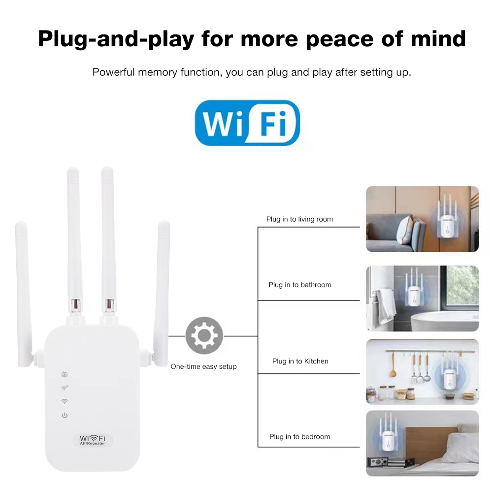 1.Simplicidad Plug-and-Play:Este repetidor WiFi inalámbrico está diseñado con una función de memoria avanzada que permite el uso inmediato después de la configuración inicial, ofreciendo una experiencia sin complicaciones ya que puede conectarlo en cualquier lugar para una conectividad instantánea.