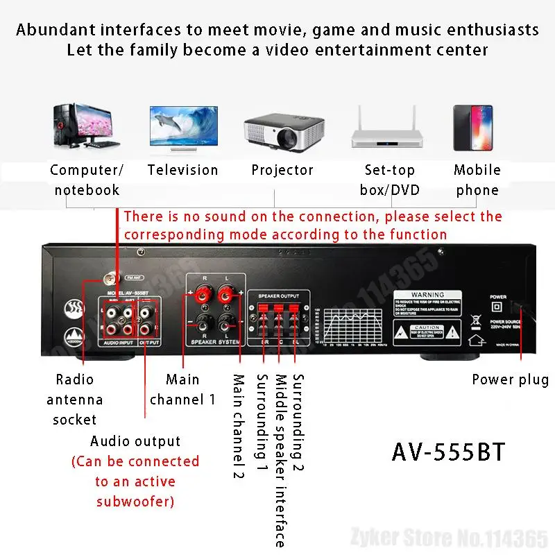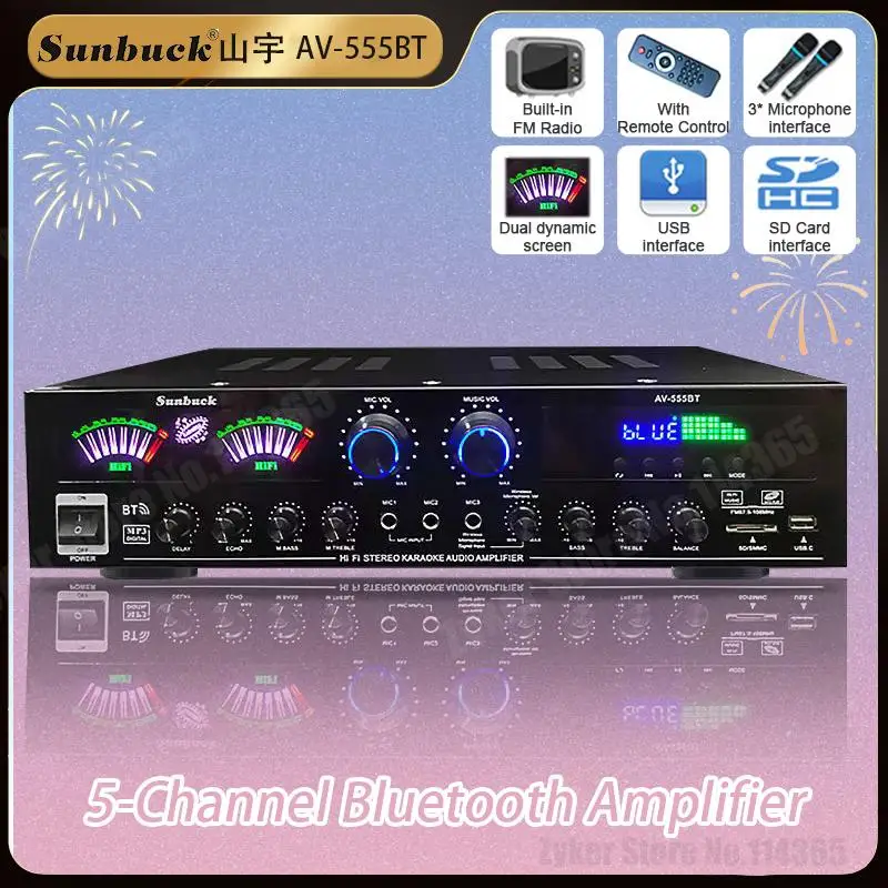 Características 1. Entrada de Micrófono dual, con 2 entradas de micrófono, con ajuste de reverberación del micrófono. 2. Bluetooth 5,0 incorporado 3. Con radio FM 4. Pantalla LED 5. Entradas de interfaz SD, USB, CD, DVD. 6. 5 canales de alta potencia 7. Amplificador de potencia de audio digital HIFI. 8. Con control remoto, más conveniente. 9. Un conjunto de altavoces es un amplificador adecuado para HIFI en casa y un amplificador para cine en casa de TV.