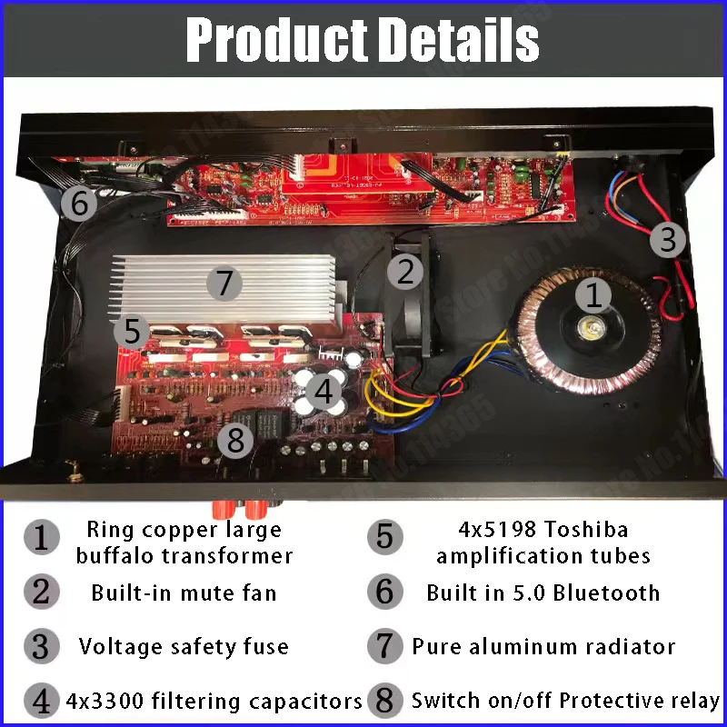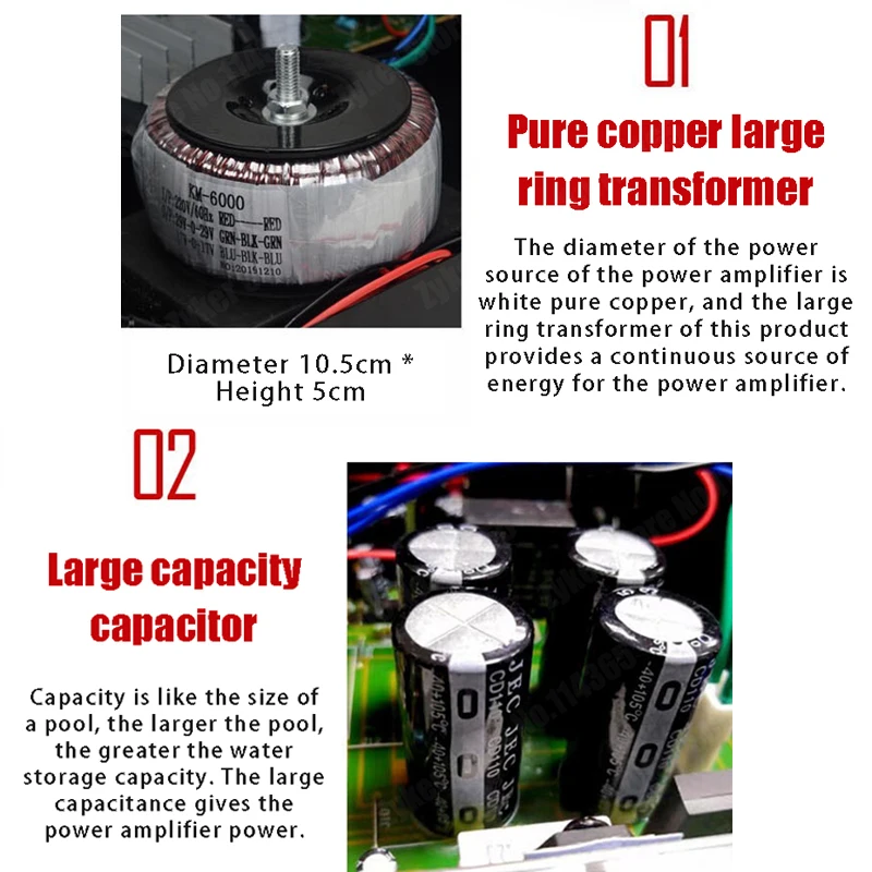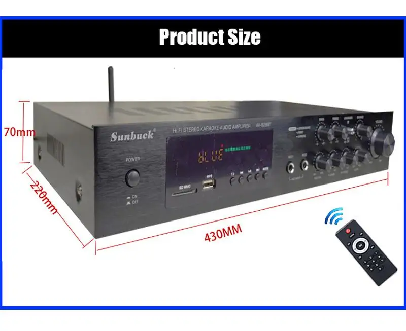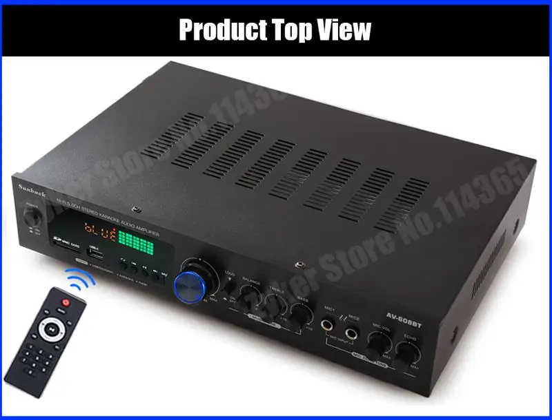 4. El dispositivo también ofrece un receptor de radio integrado para sintonizar todas sus estaciones de radio favoritas.Característica: 1.5.0 amplificador de conexiones de altavoz con radio 2,1120 W máx. Rendimiento general 3. Volumen del micrófono ajustable 4. Se suministra con control remoto 5. Controles iluminados en azul 6. Pantalla LED 7. Efecto de retardo de micrófono ajustable 8. Admite radio FM/AM. Especificación: -- Potencia máxima: 500W + 500W + 120W -- Voltaje nominal: 110V/220V -- RMS:250W + 250W + 120W -Tasa de distorsión: 0.01% -- Impedancia: 4 a 16 Ohm -- Canal: 5 canales de sonido -- Tipo de amplificador de potencia: amplificador de potencia AV -- HiFi: soporte -- Bluetooth Visión: 5,0 -- Color: negro -- Material: aleación de aluminio Empaquetado incluido: 1 x Amplificador 1 control remoto 1 manual en inglés