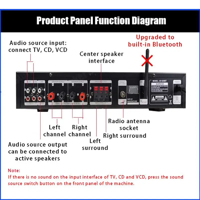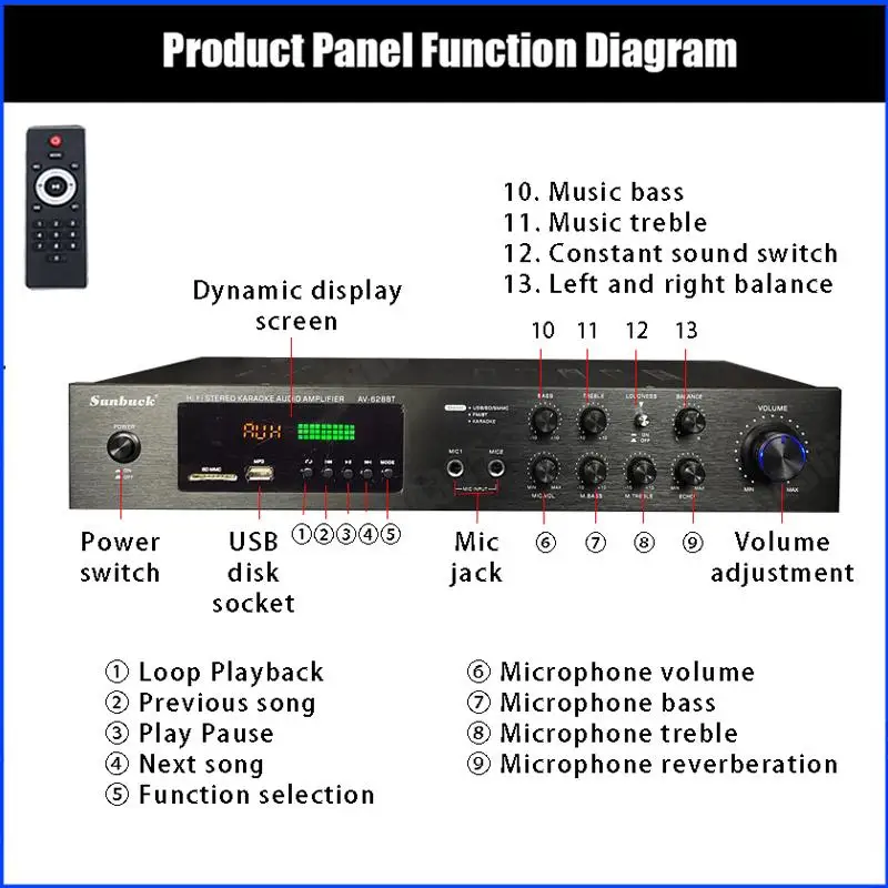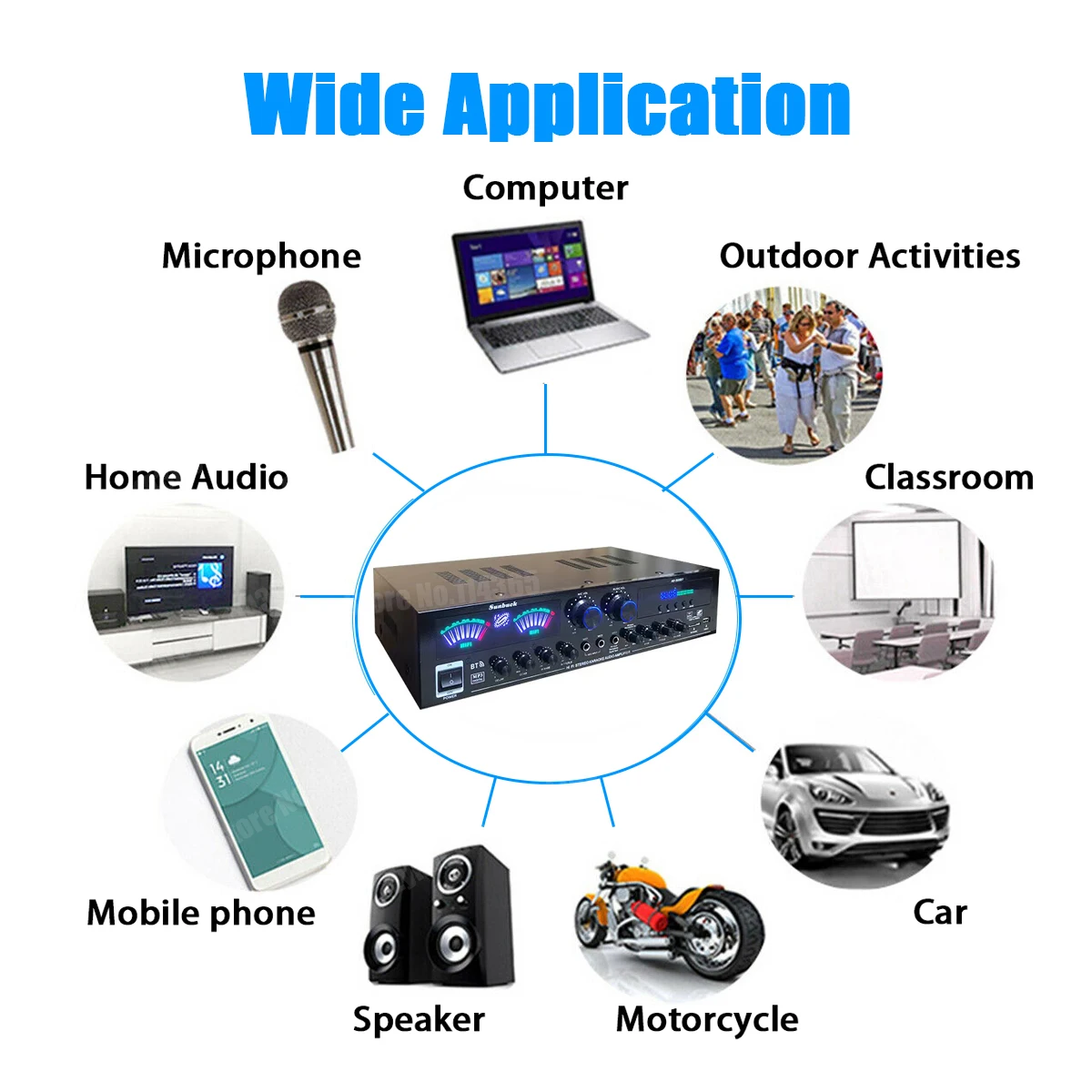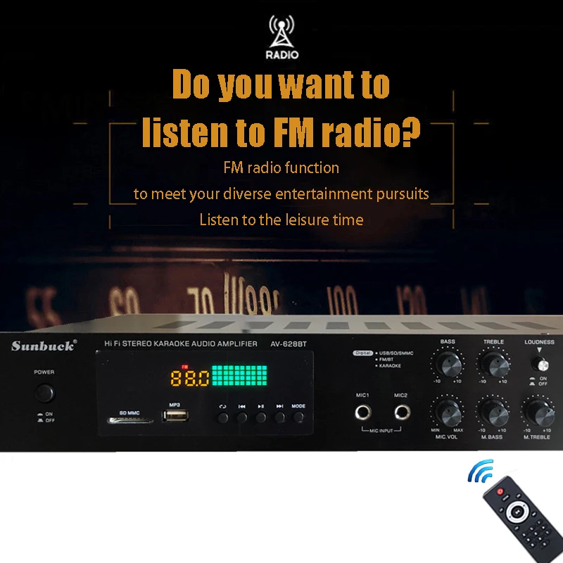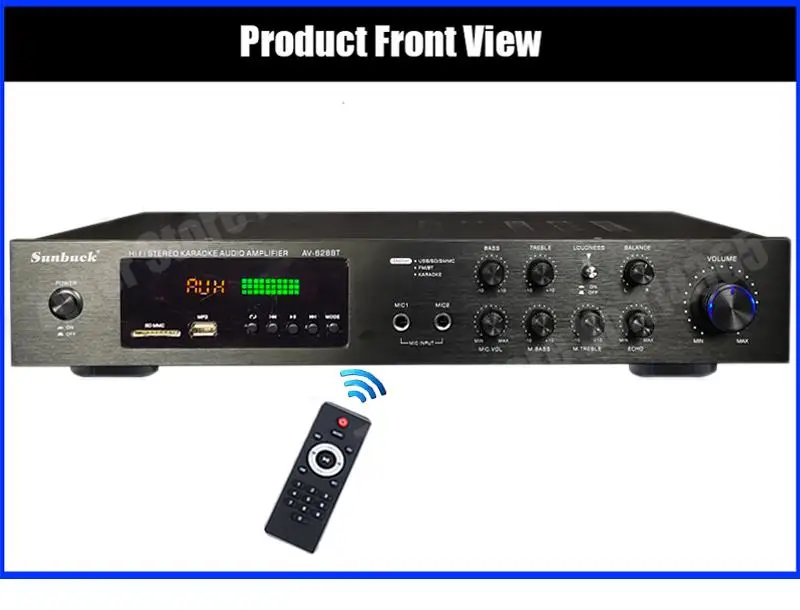 Modelo: 628BTDescripción: 1. Este amplificador es un amplificador con sonido surround multifuncional que es adecuado para Hi-Fi, cine en casa o para eventos pequeños y karaoke. 2. Las entradas RCA estéreo y la entrada Jack se pueden conectar con todo tipo de equipos de audio, como reproductores de MP3, reproductores de DVD y ordenadores, y pueden enviar el sonido a un total de 5 altavoces. 3. Como una adición útil a su función de alta fidelidad y cine en casa, también cuenta con dos entradas de micrófono en el panel frontal que le permiten entretenerse en eventos PA, fiestas de karaoke o reuniones.