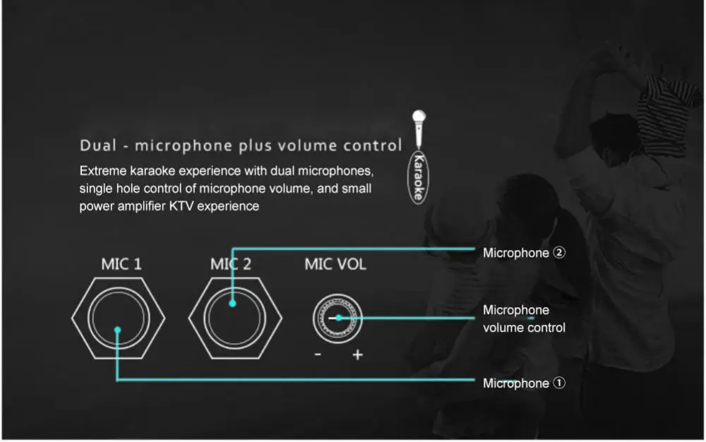 7. Entrada de Micrófono dual, reverberación ajustable; receptor inalámbrico incorporado y Radio FM.