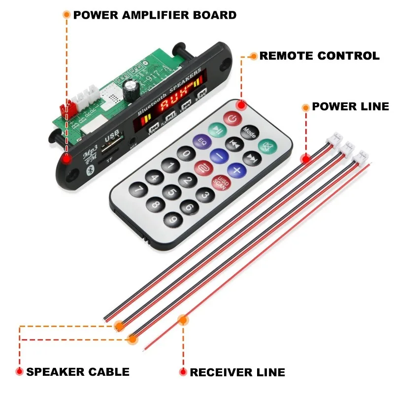 La versión de Bluetooth es la versión 5.0Formato de música: música en formato MP3/WAV/FLAC/APE sin pérdidasFrecuencia de radio FM: 87,5-107,5 MHZIntroducción a la función de soporte: admite MP3/USB/TF/LINE IN/FM/BLUETOOTH/control remotoCaracterísticas:1.Admite automáticamente conmutación USB/TF/Bluetooth/FM/AUX.Invite y convierta a cable (sonido de señal o voz en inglés opcional)2.Admite música en formato MP3/WMA/WAV.Canciones MP3 de 32-320 kbps, WAV/WMA es de 1411 kbps o menos3.Admite cambio de USB/tarjeta, música, siguiente canción, control de volumen, EQ, reproducción/pausa, parada, silencio, apagado, selección directa de canciones.4.Admite canción anterior de Bluetooth, siguiente canción, control de volumen, reproducción/pausa, silencio.5.Admite función de alimentación y almacenamiento: apaga el almacenamiento antes de reproducir la canción y puede almacenar el volumen en la posición actual.Memoria de punto de interrupción (en modo de reproducción La primera vez que restablezca el disco U o la tarjeta TF, la memoria del punto de interrupción se reproducirá por primera vez cuando se corte la energía después de aproximadamente tres segundos)Contenido del paquete:1 decodificador1 mando a distancia (sin batería)