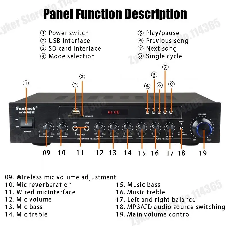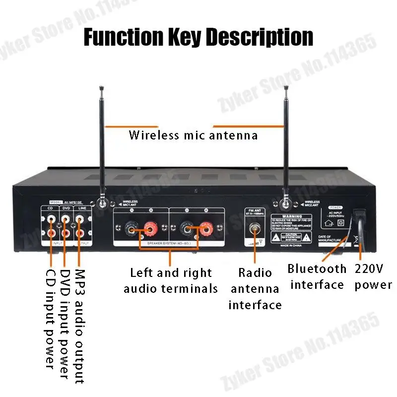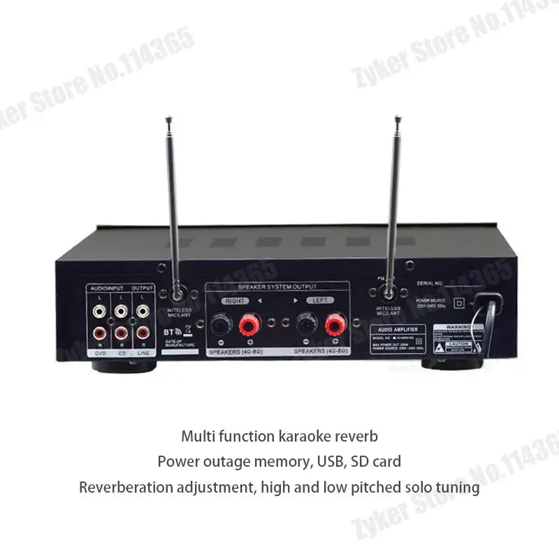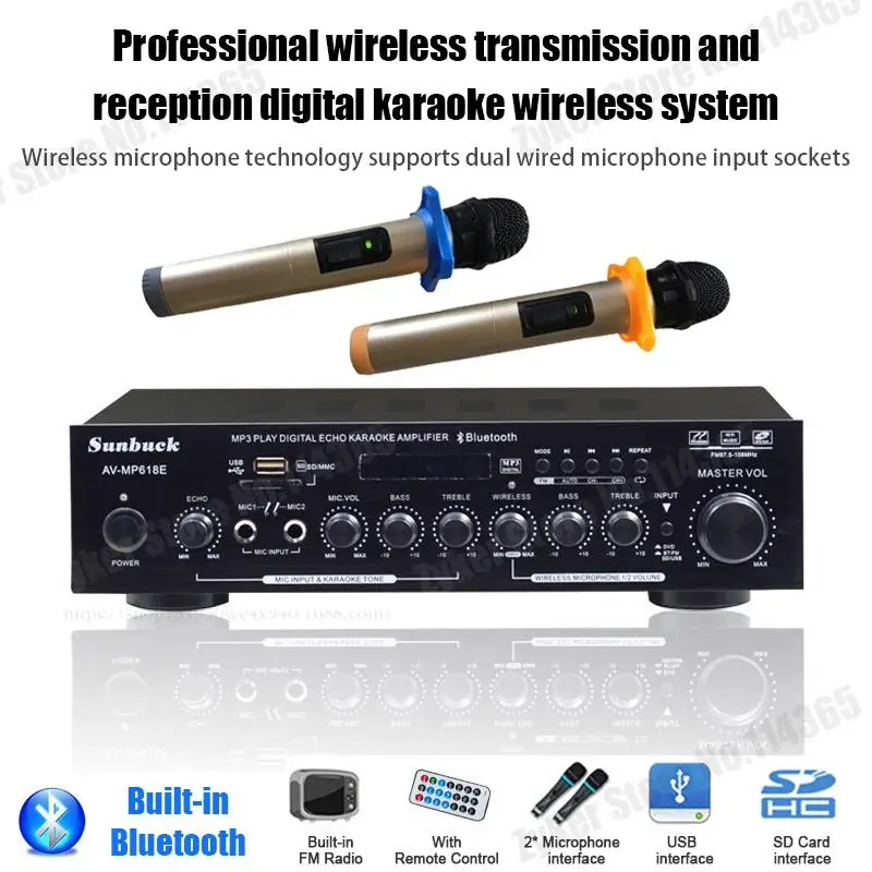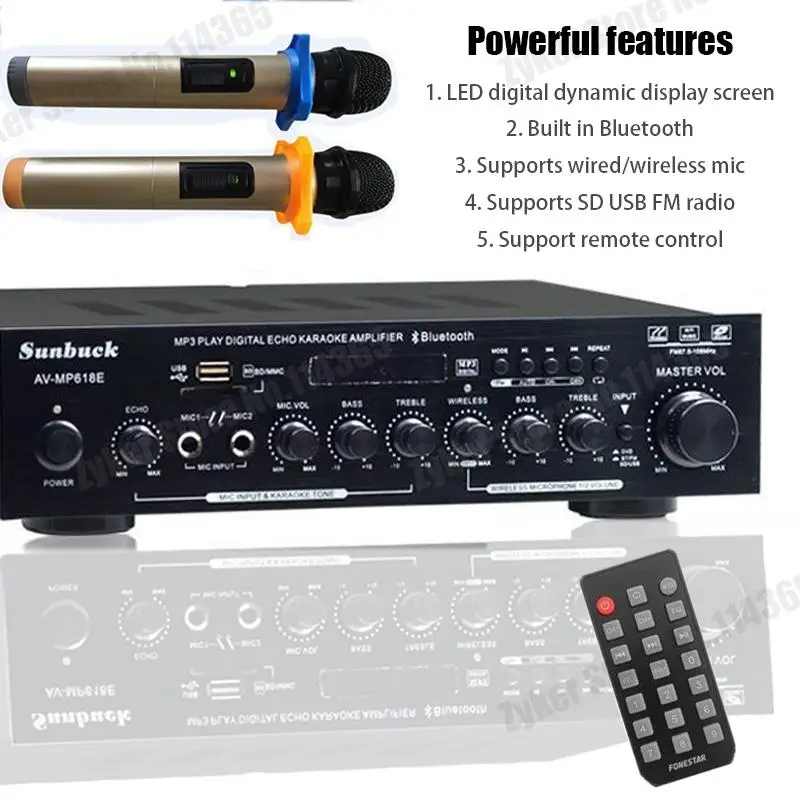2.Opción para 'con 2x micrófono inalámbrico', el micrófono inalámbrico ya está emparejado con el amplificador en la fábrica, la señal es mejor y la conexión es más estable. Se recomienda comprar la opción con un micrófono.Modelo: AV-MP619E(Con Bluetooth/Control Remoto/FM/cable de alimentación)Características: