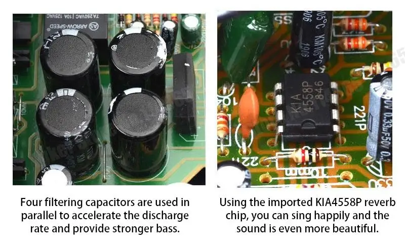 -Con 2 interfaces de micrófono, con reverberación de micrófono y ajuste de retardo, soporte para ajuste de volumen de micrófono con cable/inalámbrico.