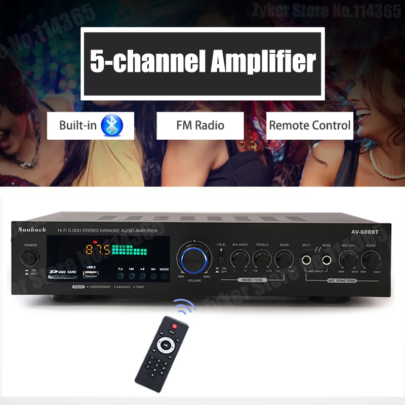 Descripción:1. ¡Este amplificador es un amplificador de sonido envolvente multifuncional adecuado para hi-fi, cine en casa o para pequeños eventos de megafonía y karaoke!2. Las entradas RCA estéreo y la entrada jack se pueden conectar con todo tipo de equipos de audio, como reproductores de MP3, reproductores de DVD y computadoras, y pueden emitir el sonido a un total de 5 altavoces.3. Como complemento útil a su función de alta fidelidad y cine en casa, también cuenta con dos entradas de micrófono en el panel frontal que le permiten entretener en eventos de PA, fiestas de karaoke o en reuniones.4.El dispositivo también ofrece un receptor de radio integrado para sintonizar todas sus estaciones de radio favoritas.Característica :Amplificador de conexiones de altavoz 1,5.0 con radio2.1120W máx.Rendimiento general3.Volumen del micrófono ajustable4.Se suministra con control remoto5.Controles iluminados en azulPantalla 6.LED7.Efecto de retardo de micrófono ajustable8. Admite radio FM/AM.Especificación:--Potencia máxima: 500W+500W+120W--Voltaje nominal: 110V/220V--RMS: 250W+250W+120W--Tasa de distorsión: 0,01%--Impedancia: 4 a 16 ohmios--Canal: 5 canales de sonido--Tipo de amplificador de potencia: amplificador de potencia AV--HiFi: soporte--Visión bluetooth: 5,0--Color: Negro--Material: aleación de aluminioEmpaquetado incluido:1 amplificador.1 mando a distancia.1 manual en inglés.1 tarjeta USB de 32 GB (regalo)999BT