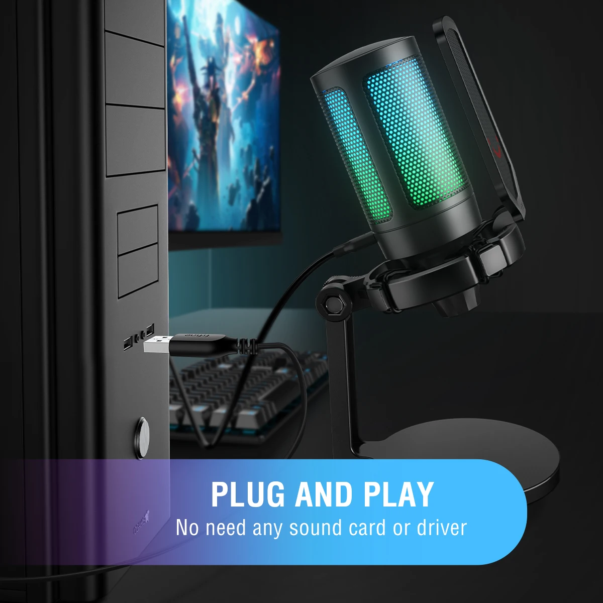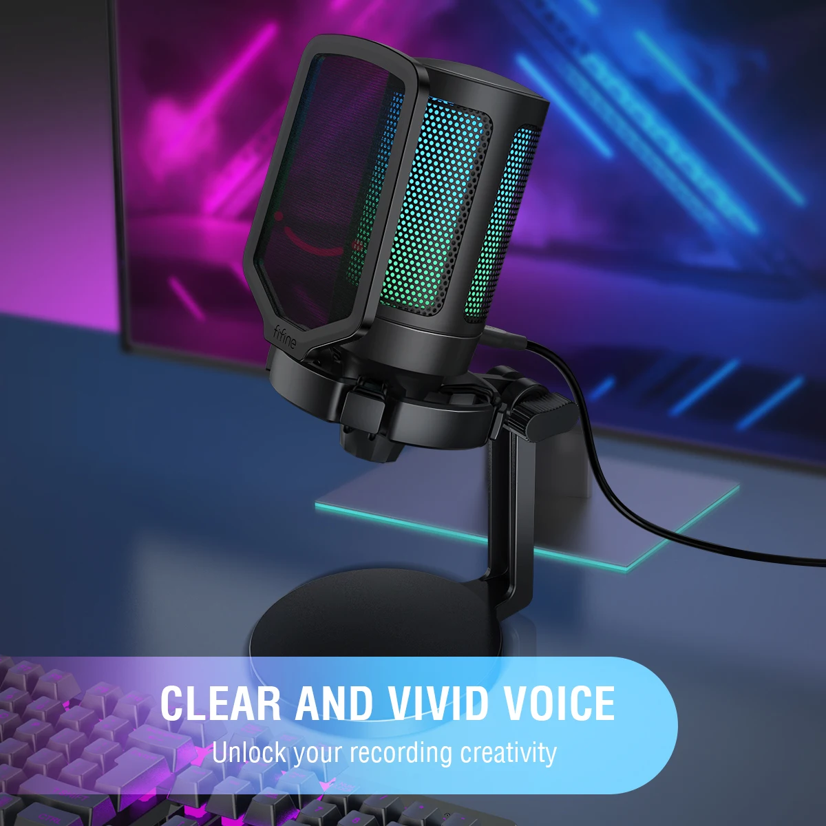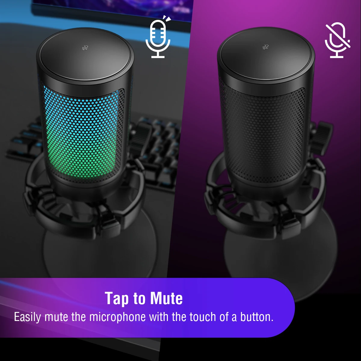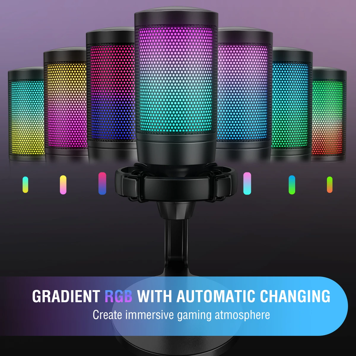 El cambio automático de 7 modos de iluminación RGB hace que su micrófono se vea elegante y fresco. Mejore su configuración de juego con efectos de iluminación RGB dinámicos que crean una atmósfera inmersiva, haciendo que su canal se destaquen.