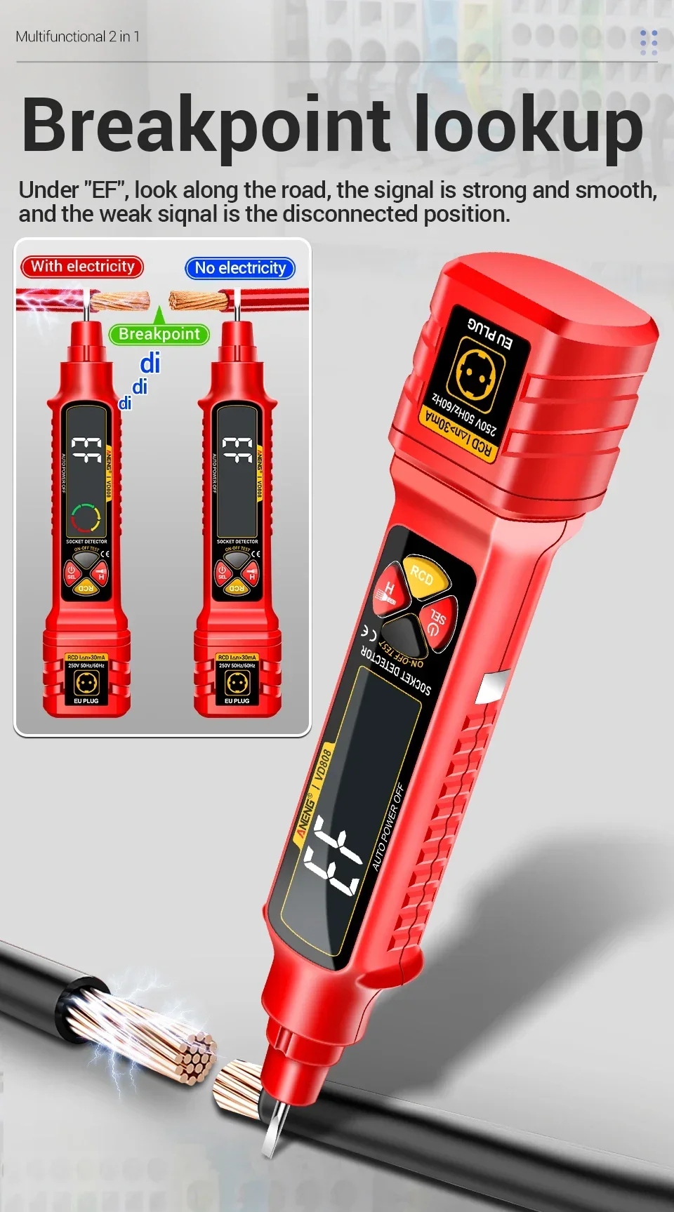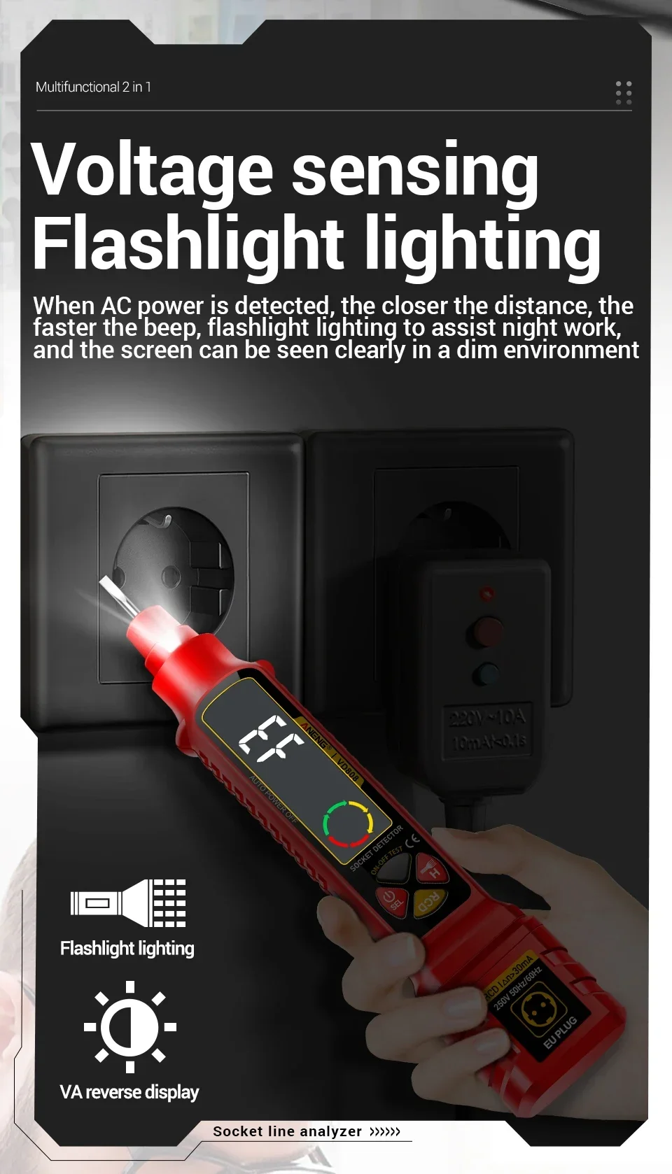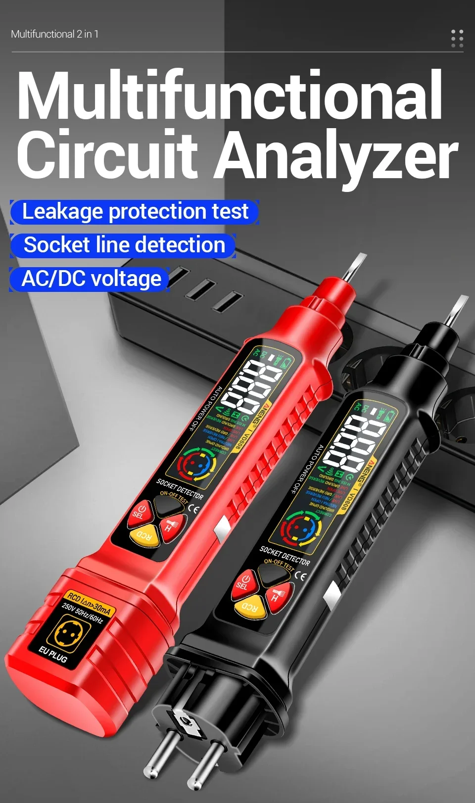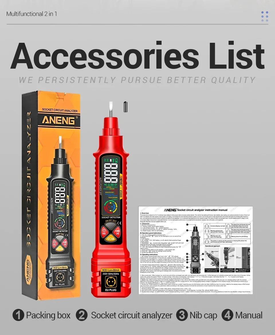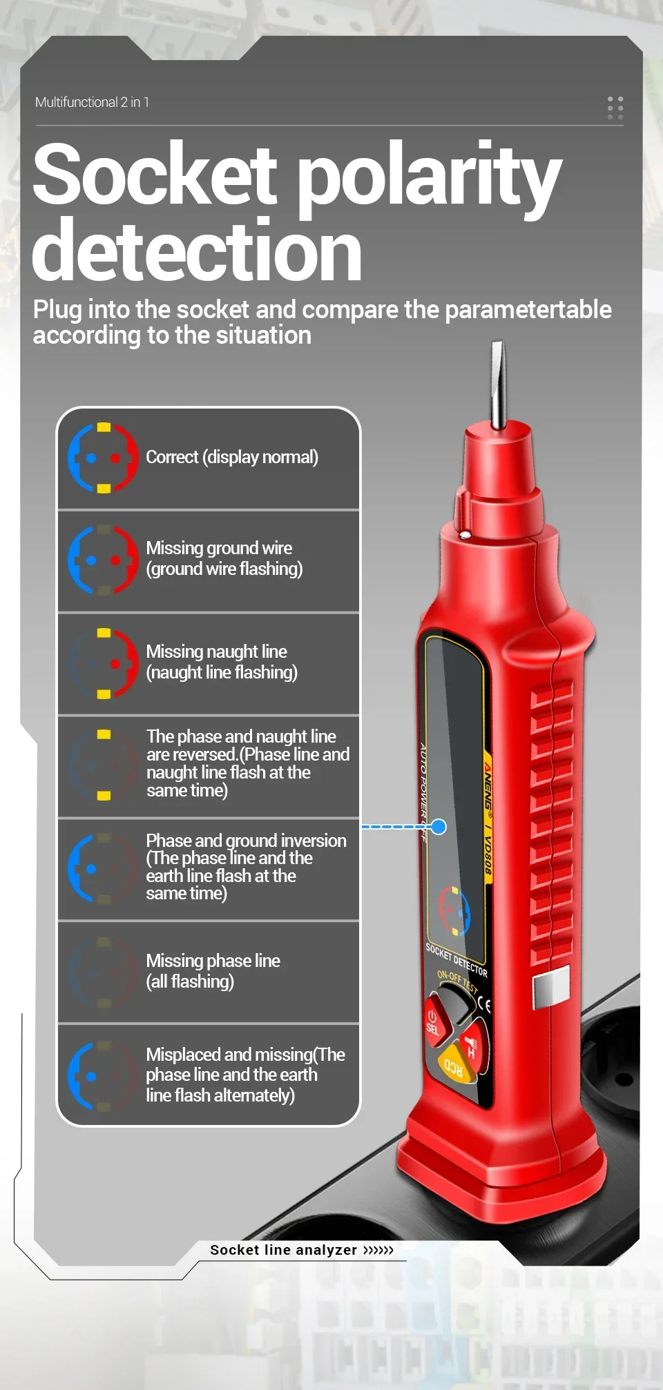 ANENG VD808, Probador de enchufes, Analizador de tomas de corriente, Probador GFCI, Detector de fallas de cableado, Herramientas de electricista, Probador de voltaje, Analizador de circuitos, Comprobación de polaridad, Voltaje AC DC, herramienta de electricista