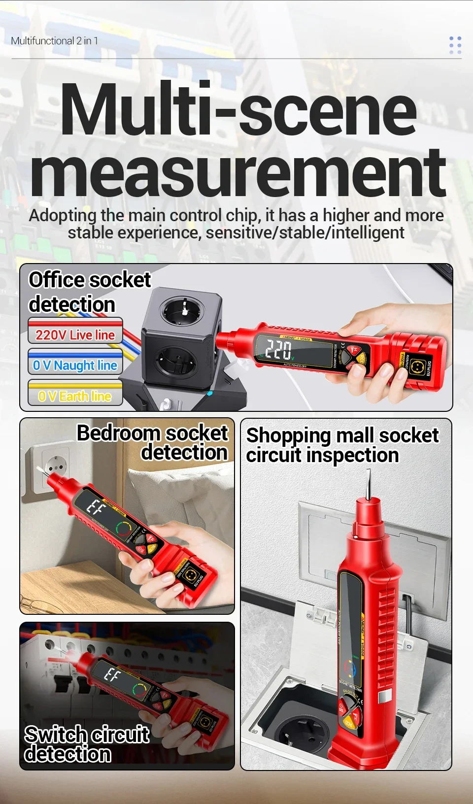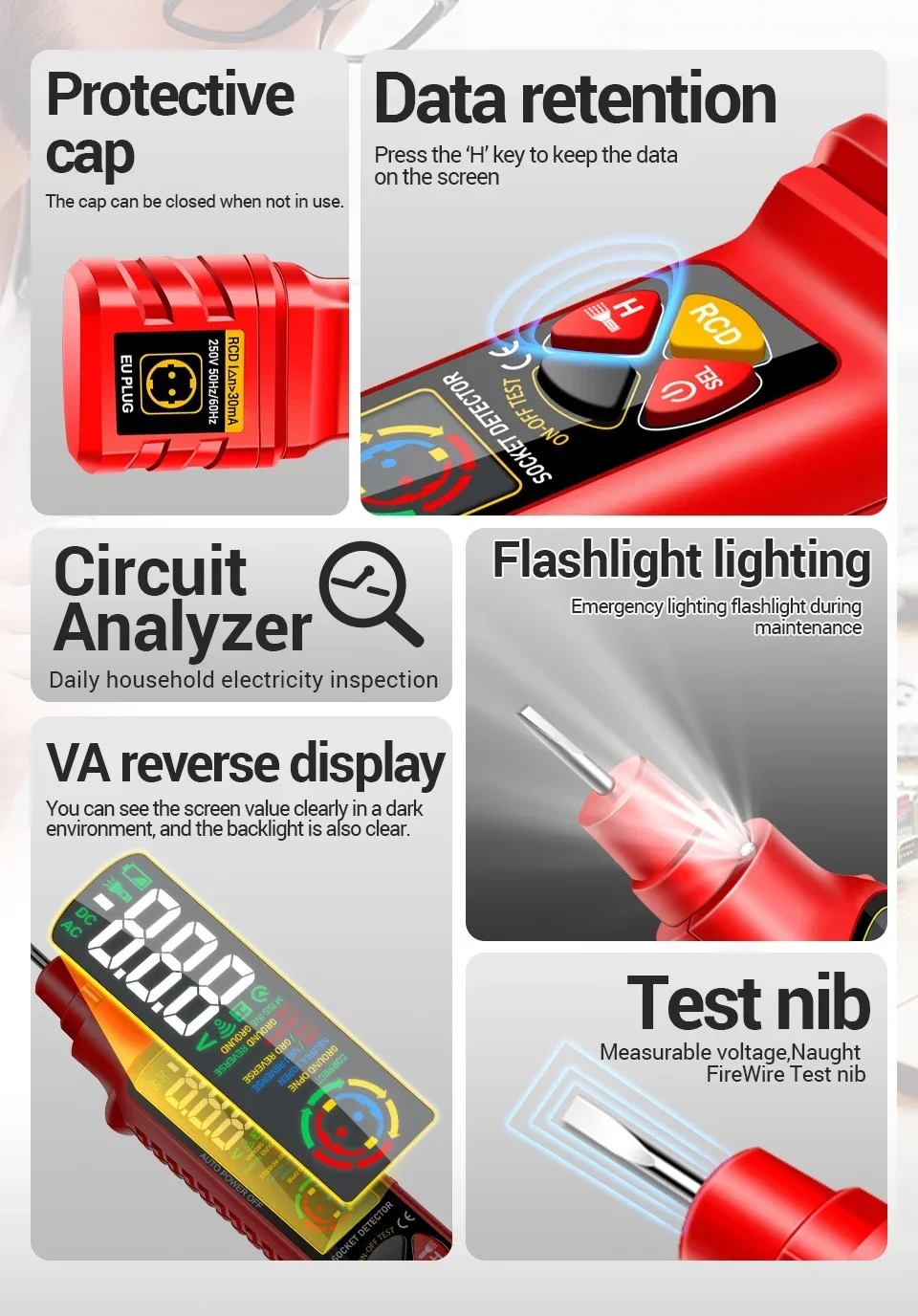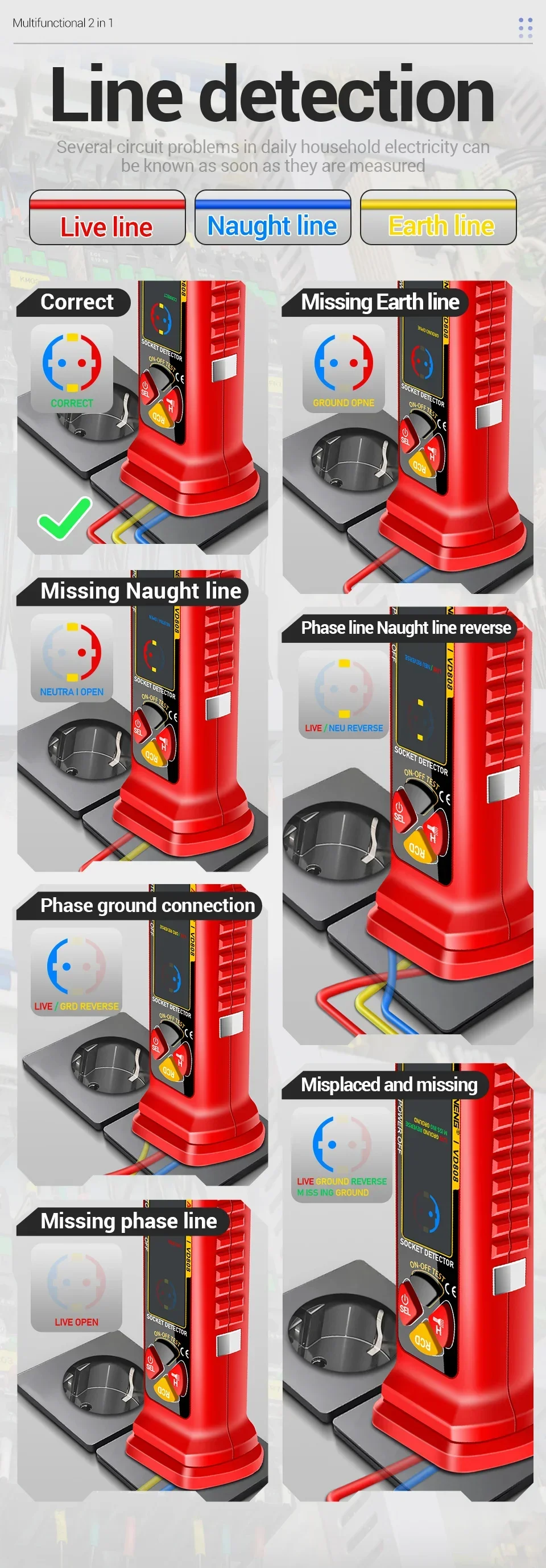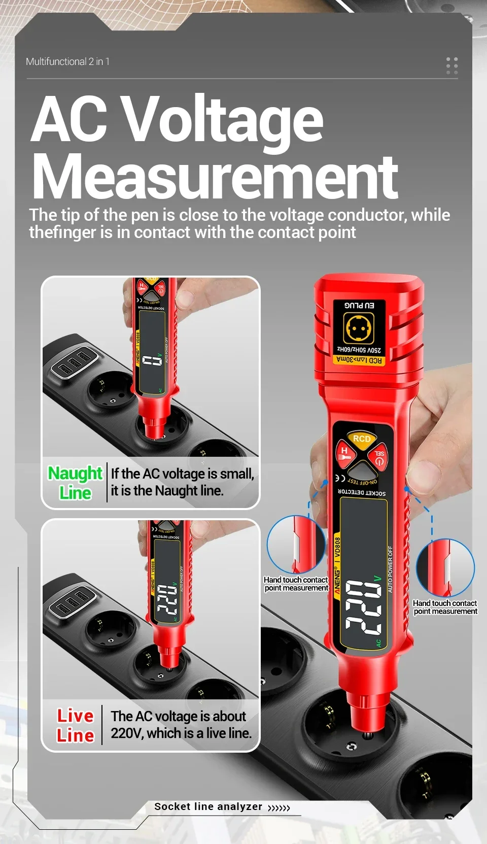 ANENG VD808, Probador de enchufes, Analizador de tomas de corriente, Probador GFCI, Detector de fallas de cableado, Herramientas de electricista, Probador de voltaje, Analizador de circuitos, Comprobación de polaridad, Voltaje AC DC, herramienta de electricista