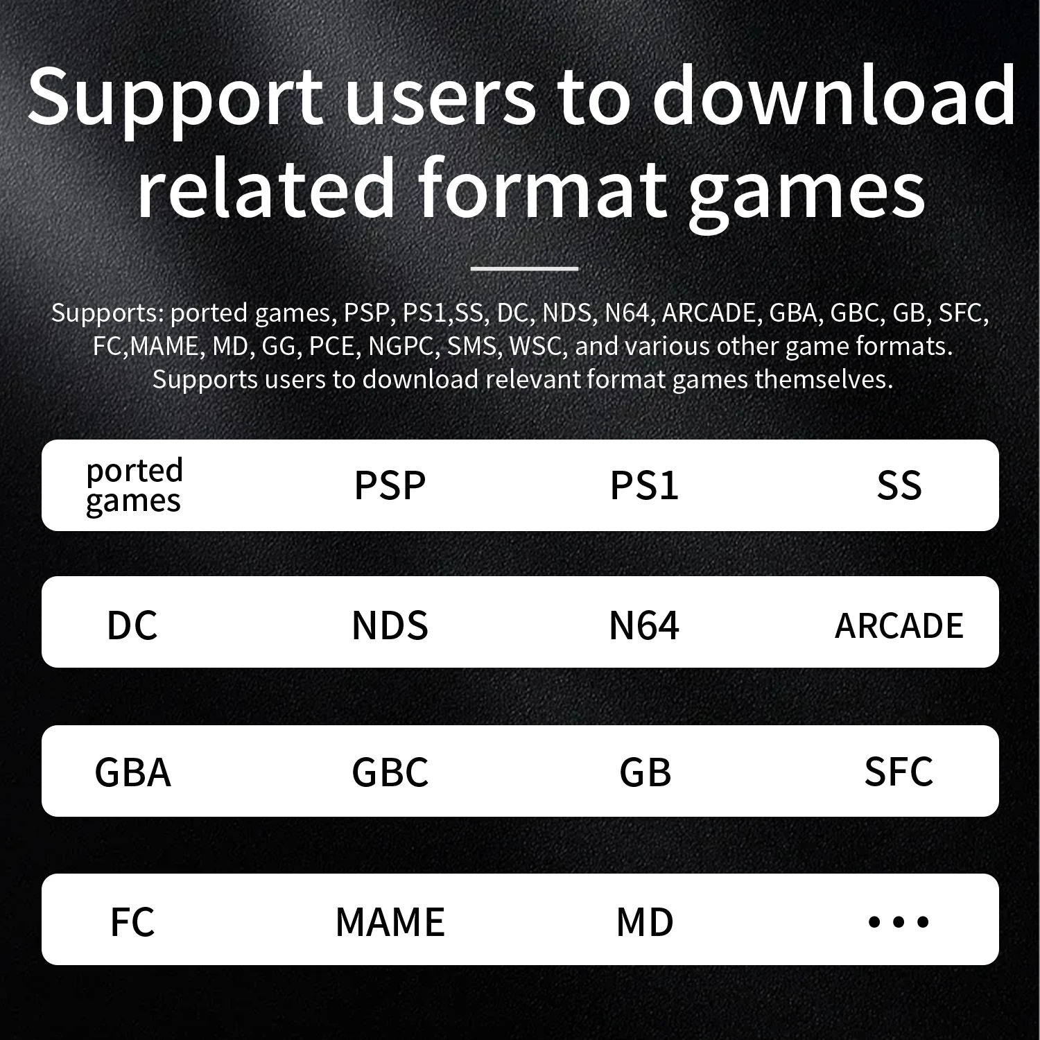 Compatible: Juegos con puerto, PSP, PS1, SS, DC, NDS, N64, ARCADE, GBA, GBC, GB, SFC, FC, MAME, MD, GG, PCE, NGPC, SMS, WSC y varios otros formatos.