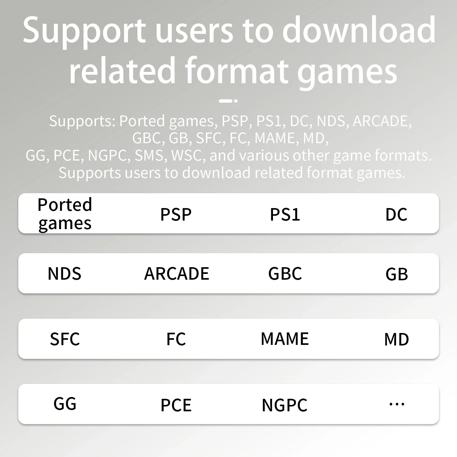 Supports: Ported games, PSP, PS1, DC, NDS, ARCADE, GBA, GBC, GB, SFC, FC, MAME, MD, GG, PCE, NGPC, SMS, WSC, and various other game formats.Supports users to download related format games.