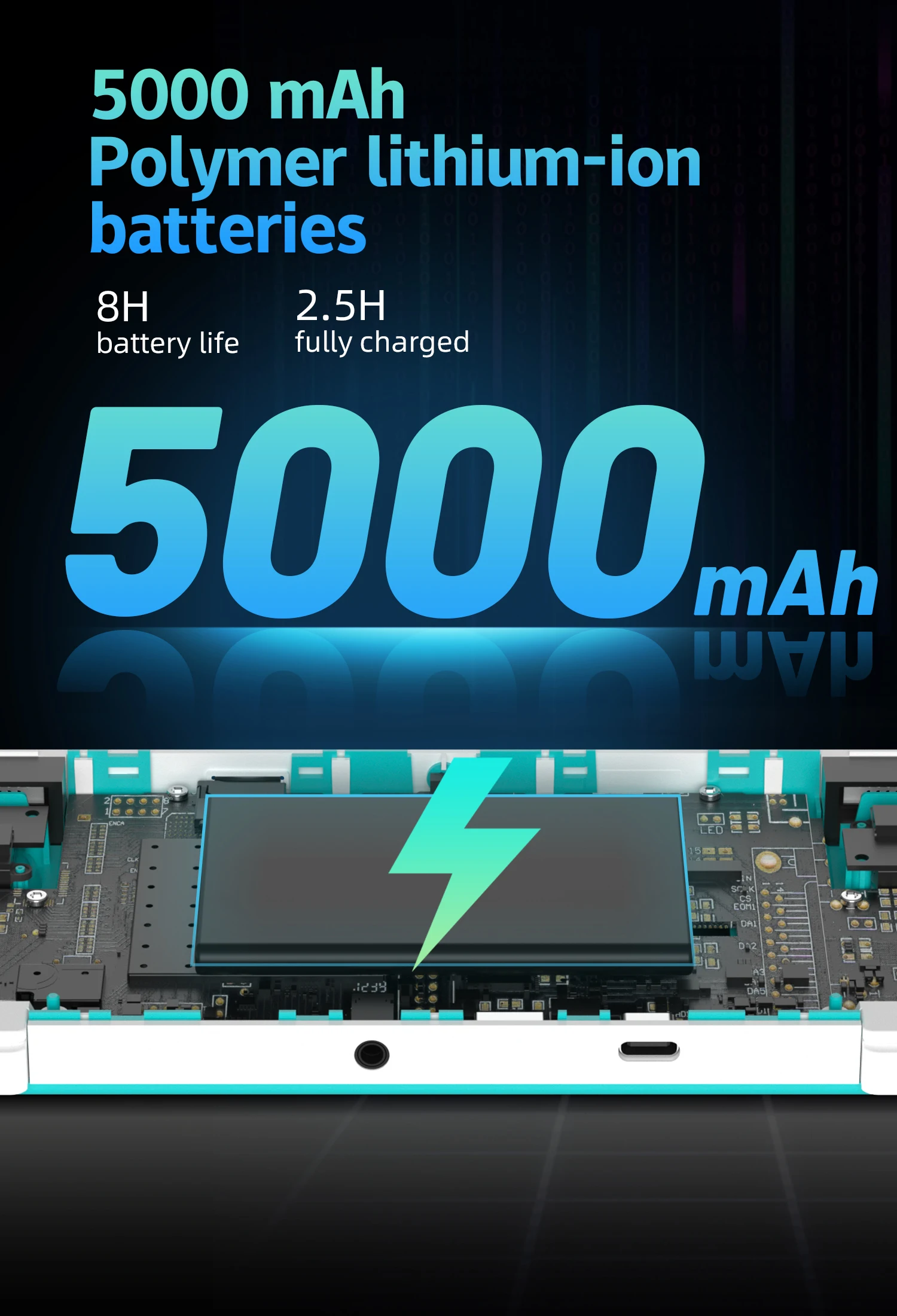 Li-polímero 5000 mAh, 2,5 horas de carga completa, duración de 8 horas