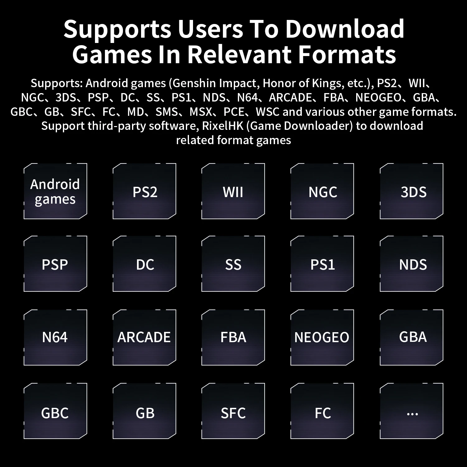 Soporte RG 476H Compatible con herramientas de terceros Descargador de juegos RixelHK, obtenga fácilmente recursos masivos y juegue sin preocupaciones.La consola de juegos es muy fácil de usar y admite una amplia gama de emulaciones y juegos compatibles.Admite múltiples simuladores, admite a los usuarios para descargar juegos de formato relacionado, admite expansión de tarjeta TF, hasta 2 TB.admite conmutación de interfaz de múltiples estilos y admite mapeo de claves;Conveniente y fácil de usar, admite múltiples formas de jugar/agregar nuevos juegos, recopilar y buscar u otras operaciones convenientes;Con el soporte de los emuladores, el RG 476H también admite visualización de pantalla dual para juegos NDS y 3DS, lo que brinda nuevas formas más emocionantes de jugar.