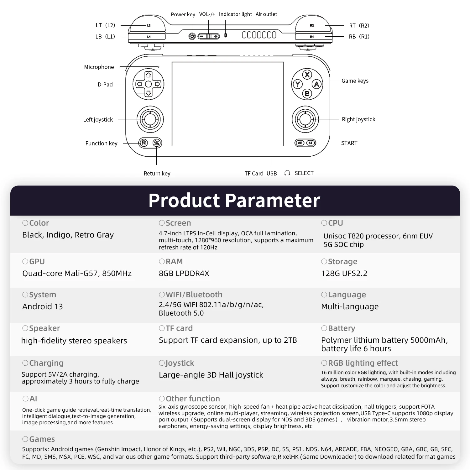 Sistema abierto RG 476H Android 13, instale libremente la aplicación y cambie entre juegos/tabletas/herramientas de oficina a voluntad.ventilador incorporado de alta velocidad + tubo de calor para refrigeración activa, que disipa eficazmente el calor generado por el funcionamiento de alto rendimiento, asegurando que el juego no se reduzca ni se atasque durante mucho tiempo.Actualización inalámbrica FOTA, admite auriculares de 3,5 mm para disfrutar de audio de alta calidad.Batería de polímero de litio de gran capacidad de 5000 mAh, duración de la batería de 6 horas, admite carga de 5 V/2 A, aproximadamente 3 horas para cargarse completamente, ya sea que esté en camino a casa después de salir del trabajo o viajar, puede usar entretenimiento en cualquier momento.Iluminación RGB de 16 millones de colores, con modos integrados que incluyen siempre, respiración, arco iris, marquesina, persecución, juegos, soporte para personalizar el color y ajustar el brillo.