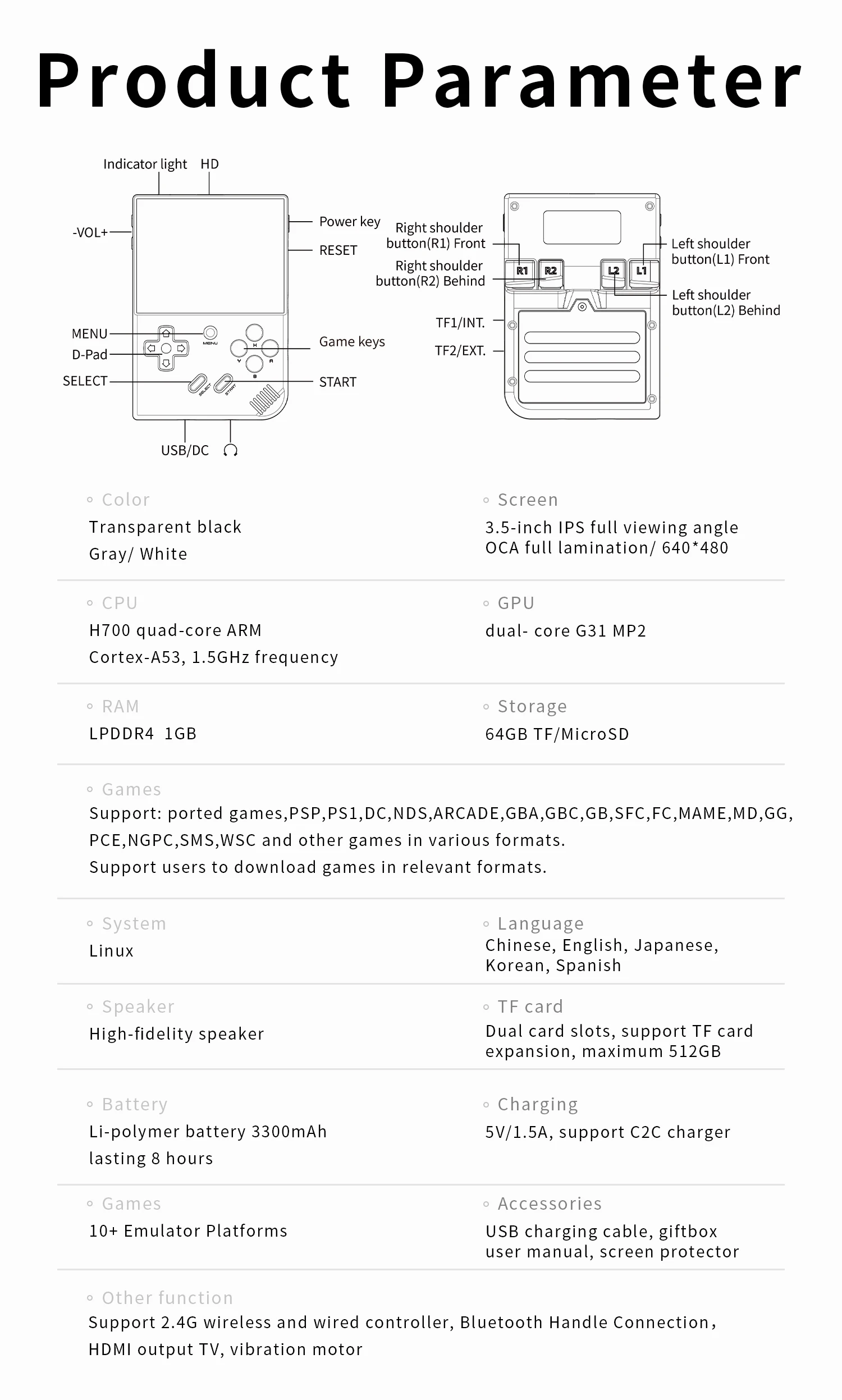 Otras funciones: Admite controlador inalámbrico y con cable 2.4G, conexión de mango Bluetooth, salida HDMI TV, motor de vibración.