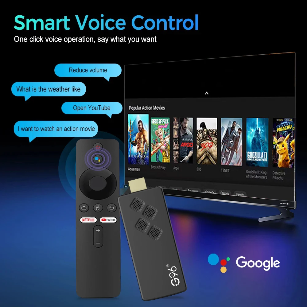 G96 TV Stick Andriod Stick 4K Ultra HD con Control remoto por voz Reproductor multimedia de transmisión Android TV BOX