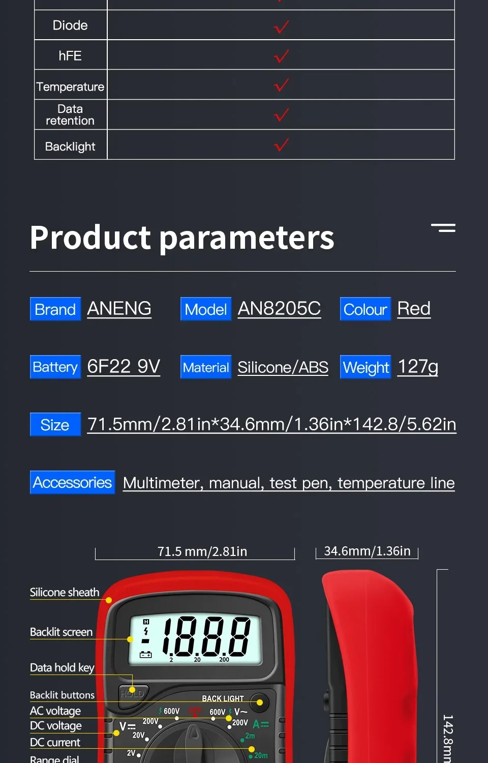 1 multímetro digital ANENG AN8205C (la batería no está incluida)