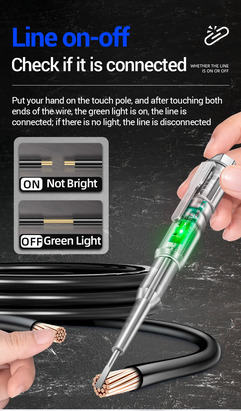 4.Detección de interruptor eléctrico: el bolígrafo eléctrico hace contacto con la varilla de contacto, si el núcleo interno del cable no está dañado, la luz LED verde se iluminará; Si está apagado, el núcleo interno del cable está en mal contacto.