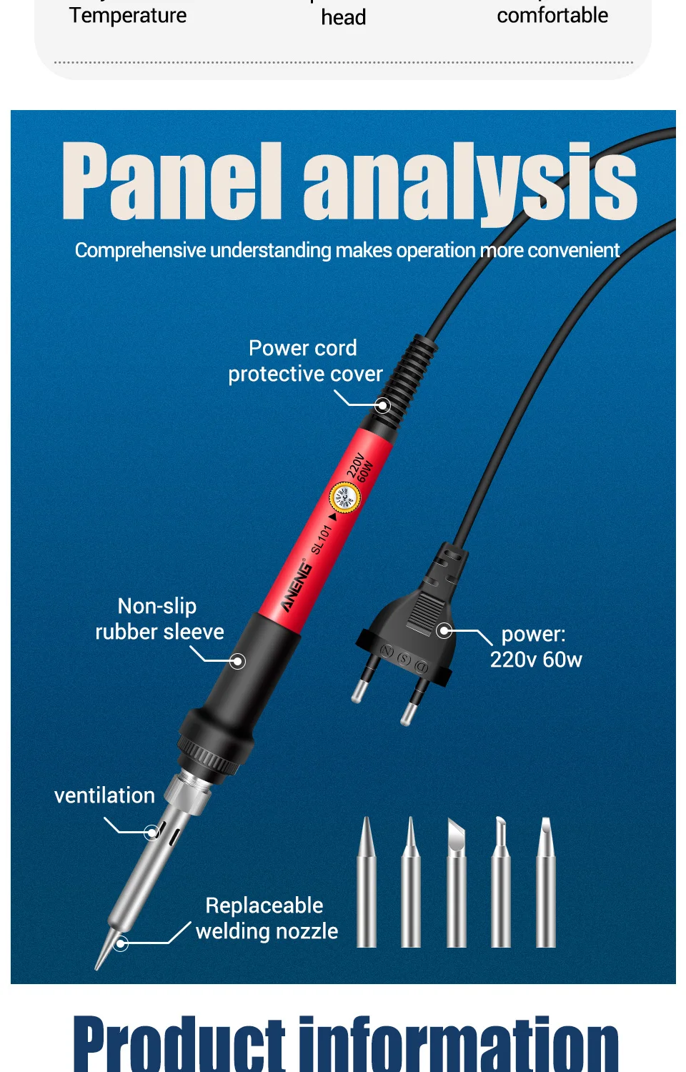 ANENG SL101 60W soldador eléctrico temperatura ajustable 220V 110V herramienta de soldadura calentador de cerámica punta de soldadura Introducción: Esta Estación de diseño compacto es ideal para uso profesional. La soldadura se puede realizar y ajustar desde la perilla de control de 200 °C a 450 °C. Las Puntas intercambiables chapadas en hierro están disponibles para hacer que la estación de soldadura sea excelente para uso electrónico y eléctrico. Características: 100% nuevo a estrenar. La herramienta de soldadura profesional es ideal para semiconductores de soldadura sin plomo Calentador de cerámica de larga duración de alta calidad. Soldadores con control de temperatura ajustable: 200-450 ° C (hay una rueda de perilla en la pistola de soldadura electrónica para ajustar la temperatura) Ideal para pasatiempos, kits, radios y trabajos de electrónica. La punta chapada en hierro y la construcción de acero inoxidable ofrecen una construcción de acero más larga que ofrece una vida más larga. Funcionamiento: Limpie las piezas a unir Limpie la punta del soldador y "Estañe" todas las caras de la punta con un recubrimiento de soldadura Piezas de calor (sin soldadura) para unir Aplique soldadura de núcleo fundente a las piezas calentadas, no hasta que me suelde la punta de soldadura, y caliéntela hasta que la soldadura se derrita y fluya libremente. Precaución: Cuando el soldador se enchufa por primera vez, sale humo del extremo de la punta. El humo se detiene en un momento y el humo nunca vuelve a salir. Use soporte para soldar y otras ayudas para evitar retozar los dedos. No tire de la soldadura y otras ayudas para evitar quemaduras en los dedos. Después de terminar la cara de la punta de vida más larga No lime la cara de la punta de larga duración y no aplicar demasiada soldadura innecesariamente. Especificación: