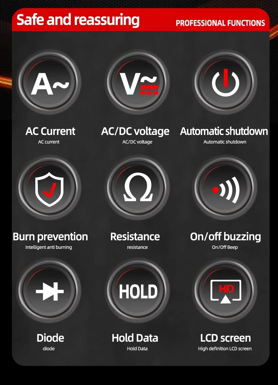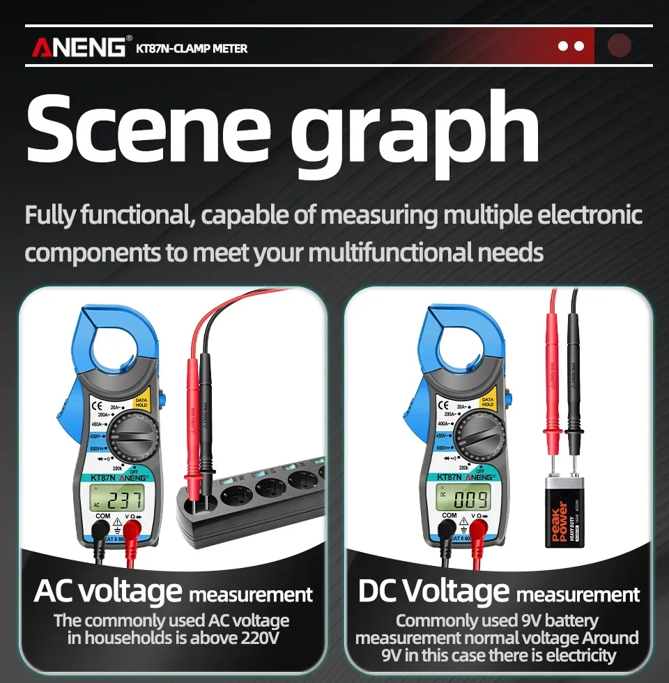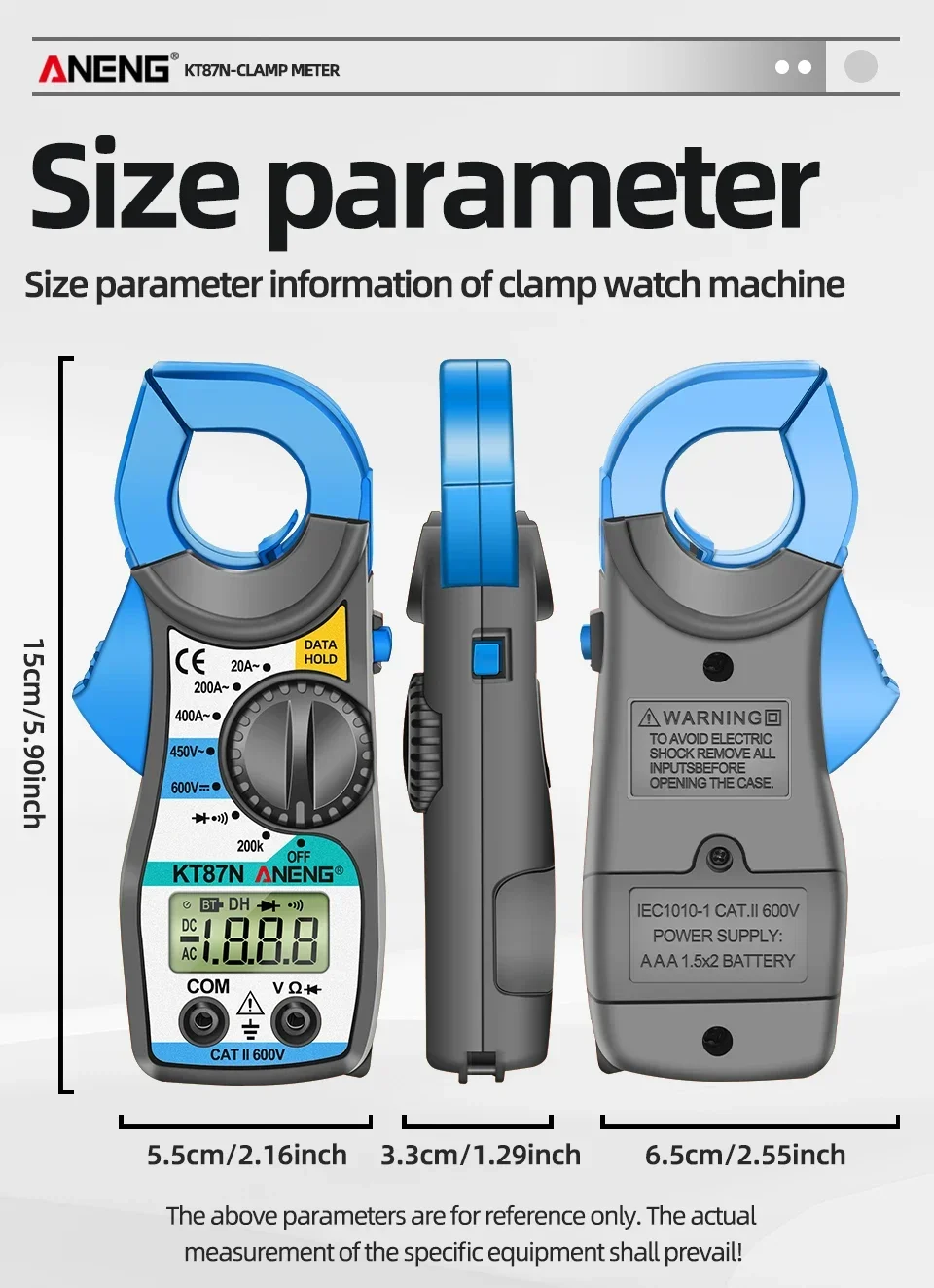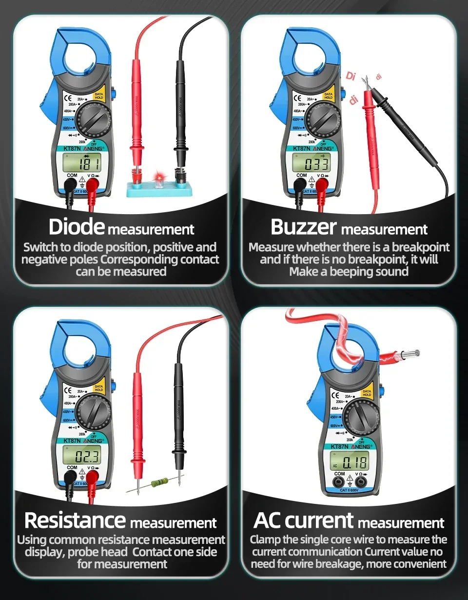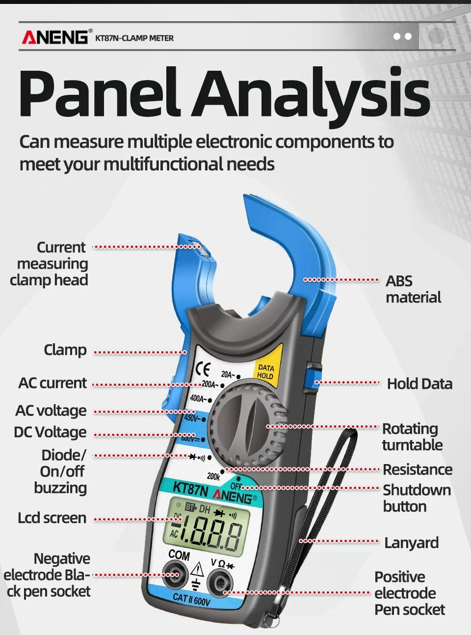 ANENG KT87NMultímetro Digital, pinzas amperimétricas, voltaje CA/CC, corriente de 600V, multímetros RMS verdadero, herramientas de prueba eléctrica de capacitanciaDescripción:Amperímetros de pinza conocidos como pinza amperimétrica.El trabajo se compone principalmente de un medidor de corriente electromagnética y un inductor mutuo de corriente tipo casquillo.Núcleo del transformador de corriente directo hecho de apertura móvil y abrazadera en amperímetro, llamada.El modelo de utilidad se refiere a un instrumento portátil que puede medir directamente la corriente CA de un circuito sin desconectar el circuito.Especificaciones:Nombre del producto: amperímetros de abrazaderaVoltaje CC: 600 V, ±1,0 %Voltaje CA: 450 V, ±1,2%Corriente CA: 20-200-400 A, ±2,0 %Resistencia (ohm): 200 KΩ, ±1,0%Función de zumbador: SíPantalla LCD máxima: SíFunción de retención de datos: SíVisualización máxima: 1999Tipo de batería: 2 x 1,5 V (batería AAA) (no incluida)Material: plástico, piezas electrónicas.Longitud del cable: Aprox.0,7 millonesEl paquete incluye:1 multímetro digital con abrazadera ANENG KT871 x cables de prueba1 manual de usuario en inglés.