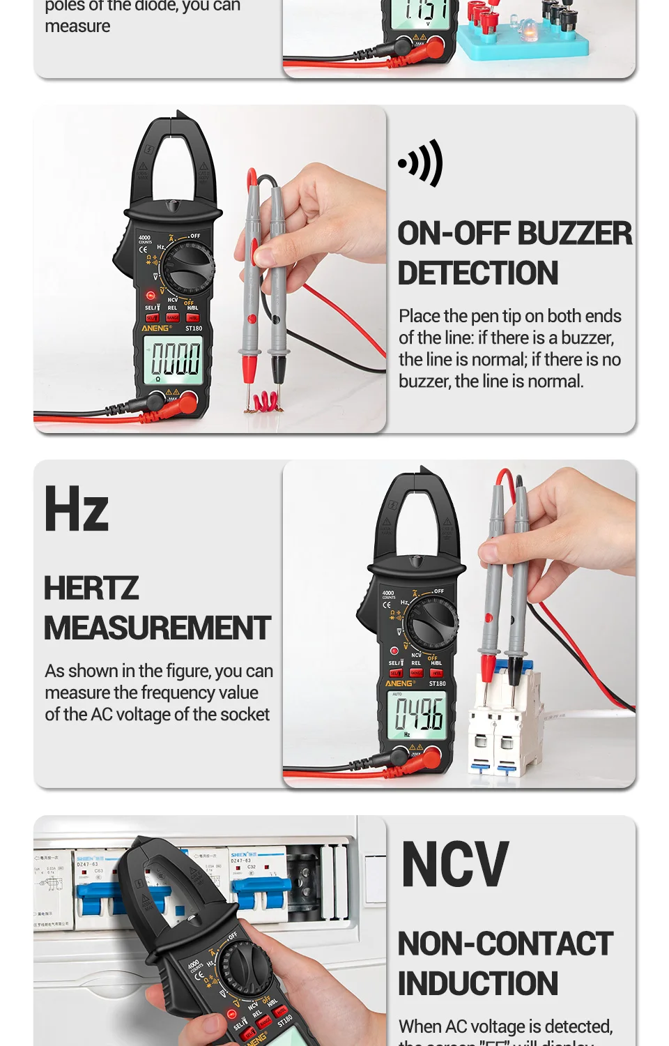 • Medición de alta precisión :El medidor de pinza digital ANENG ST180 proporciona una medición precisa de la corriente de CA, voltaje, capacitancia y NCV, lo que lo convierte en una herramienta confiable para el trabajo eléctrico.