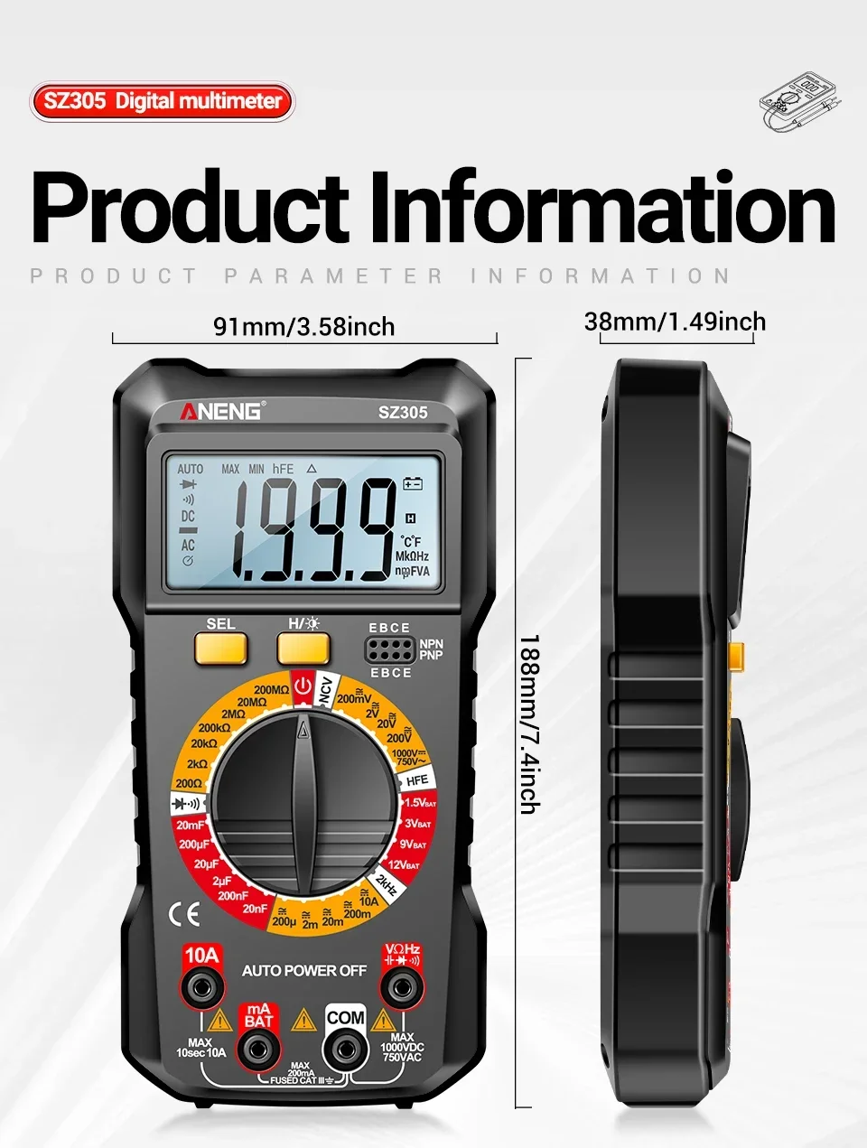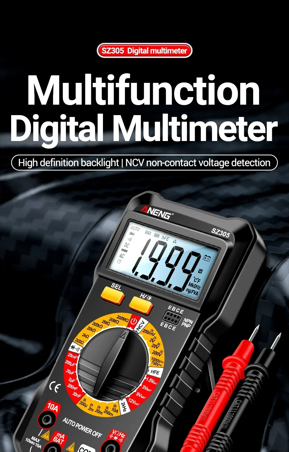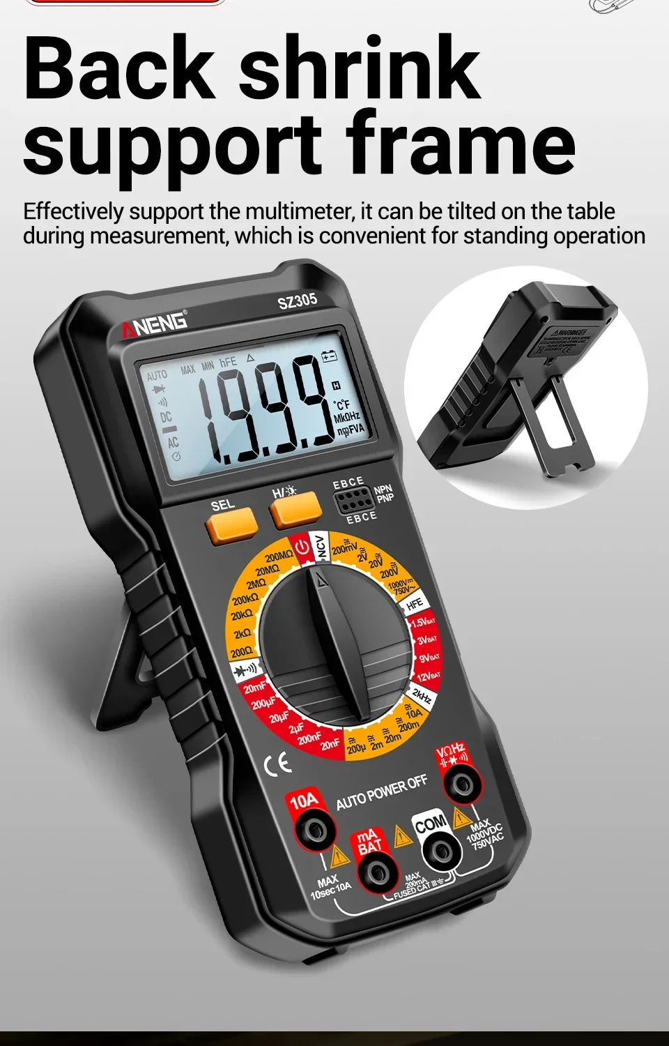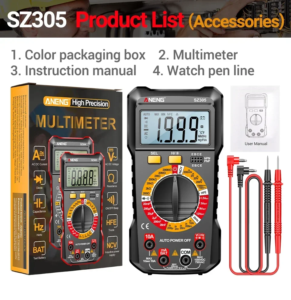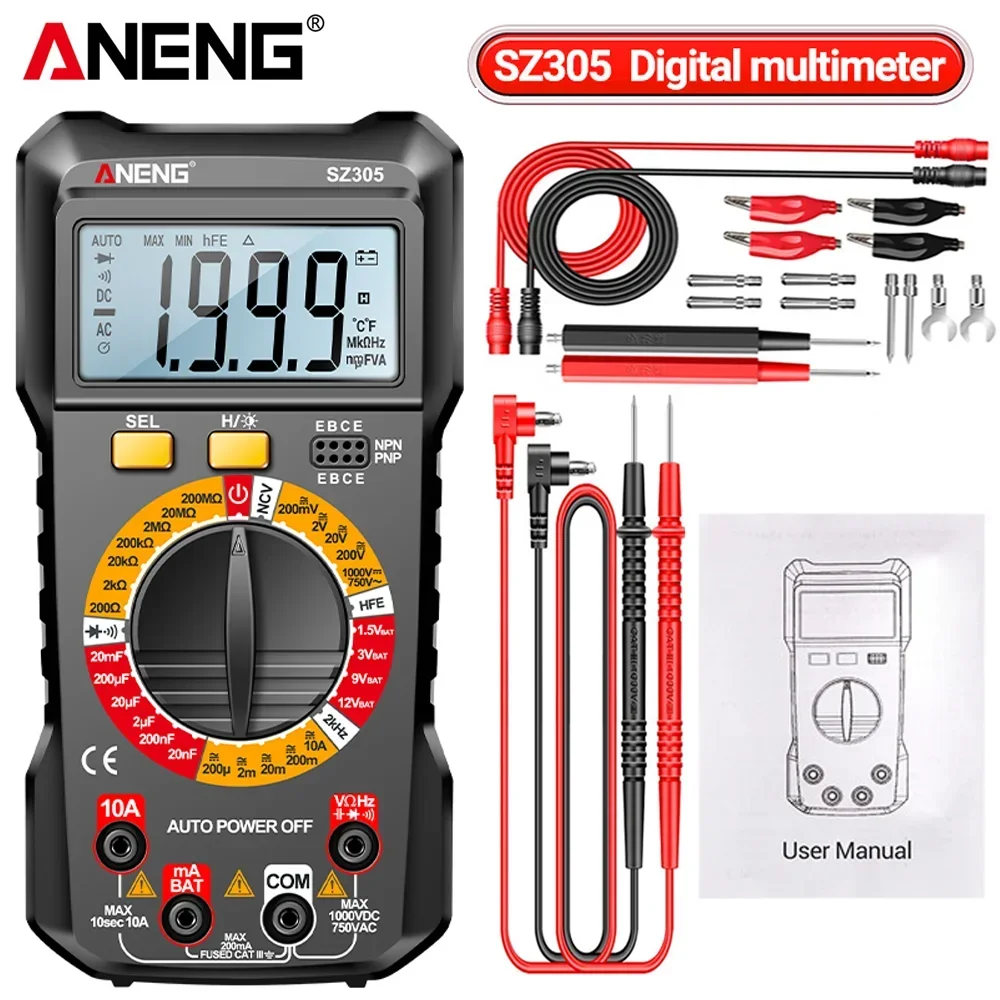 Comprar ANENG-multímetro Digital SZ305, profesional, 1999 recuentos, amperímetro de corriente CA, voltímetro, condensador, triodo hFE, herramienta de prueba de Detector Hz