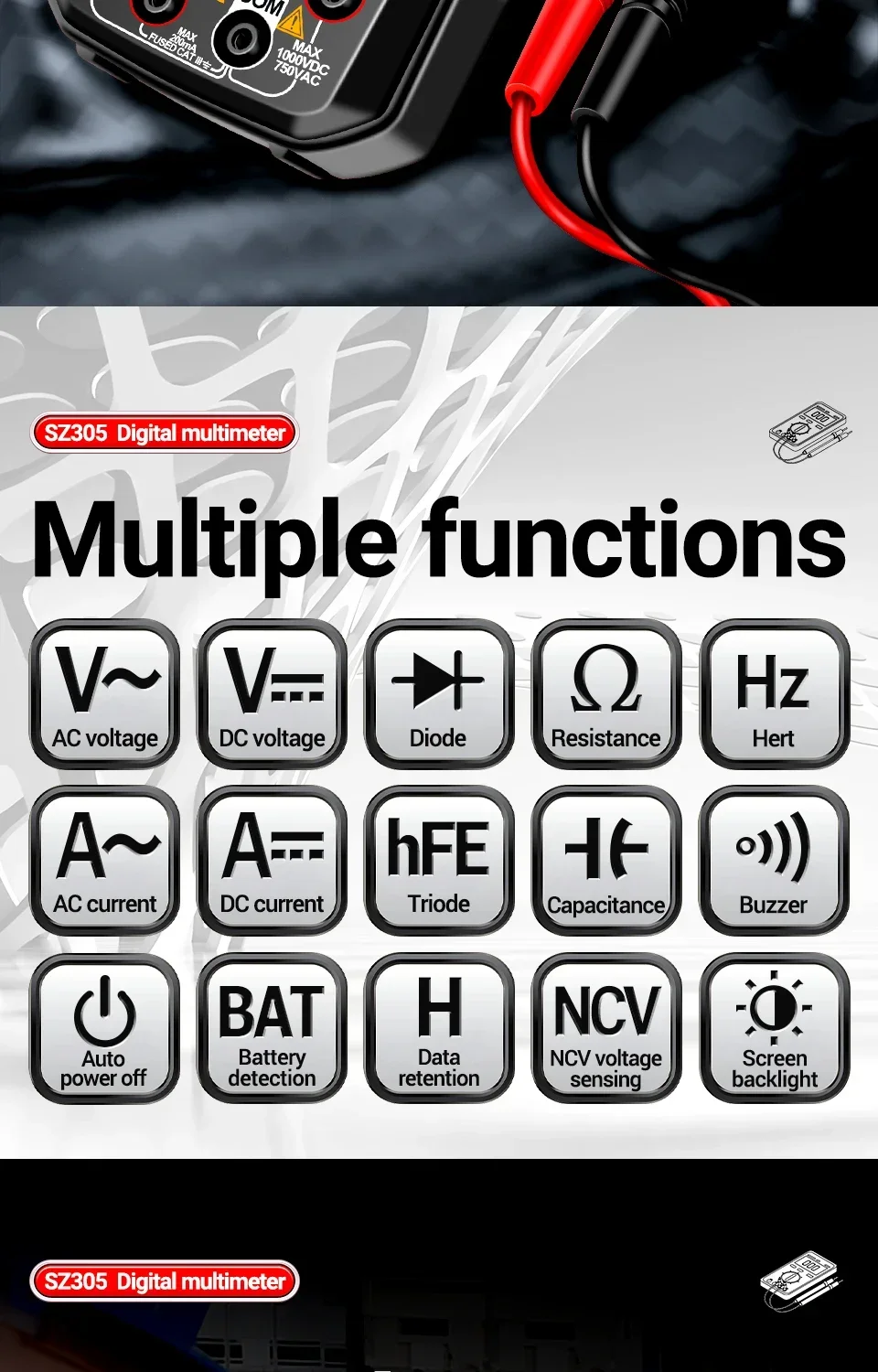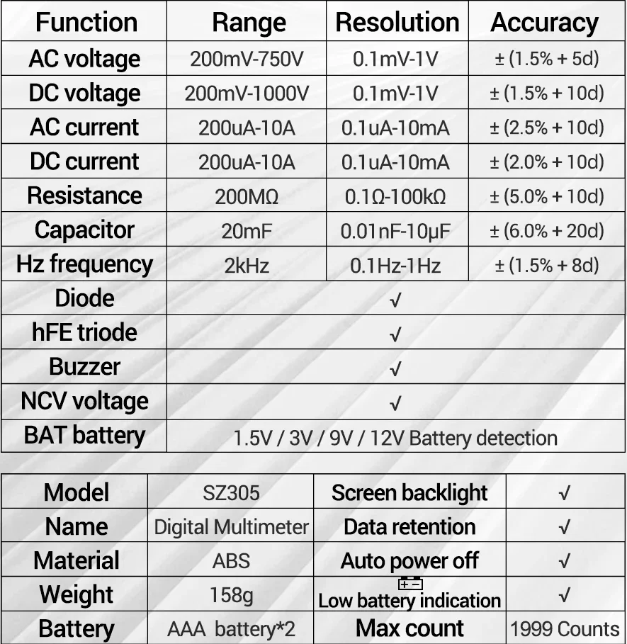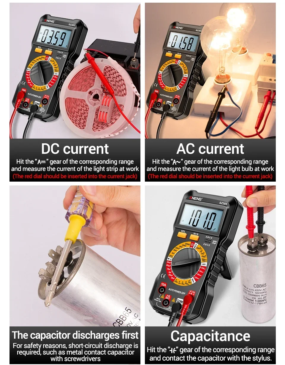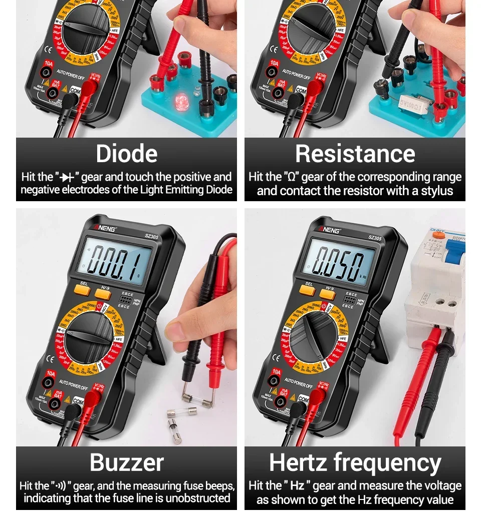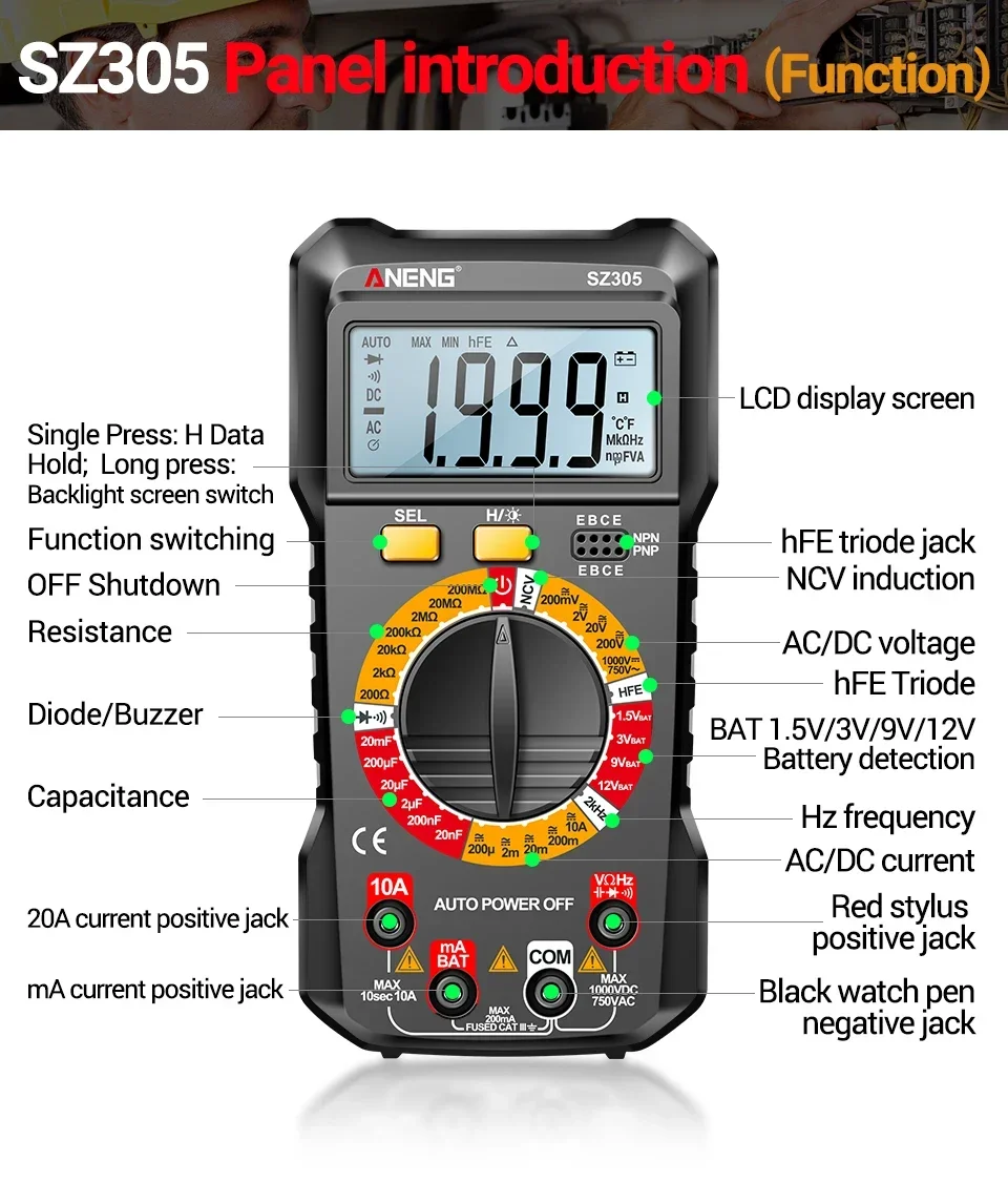Comprar ANENG-multímetro Digital SZ305, profesional, 1999 recuentos, amperímetro de corriente CA, voltímetro, condensador, triodo hFE, herramienta de prueba de Detector Hz