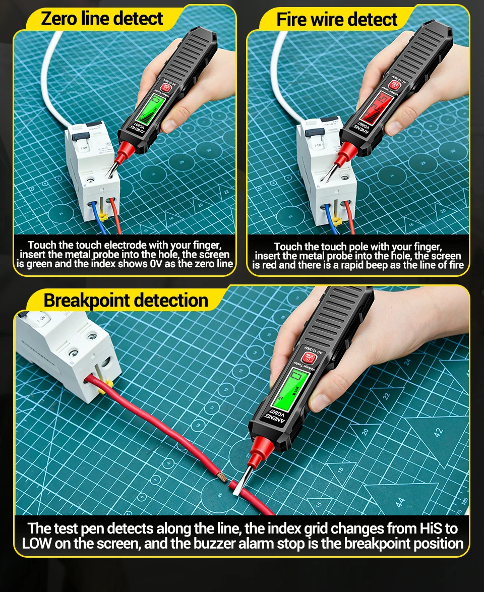 4.Buscador de línea viva NCV: LED rojo + timbre cuando está cerca de CA; Rastrear el cable se rompe sin contacto.