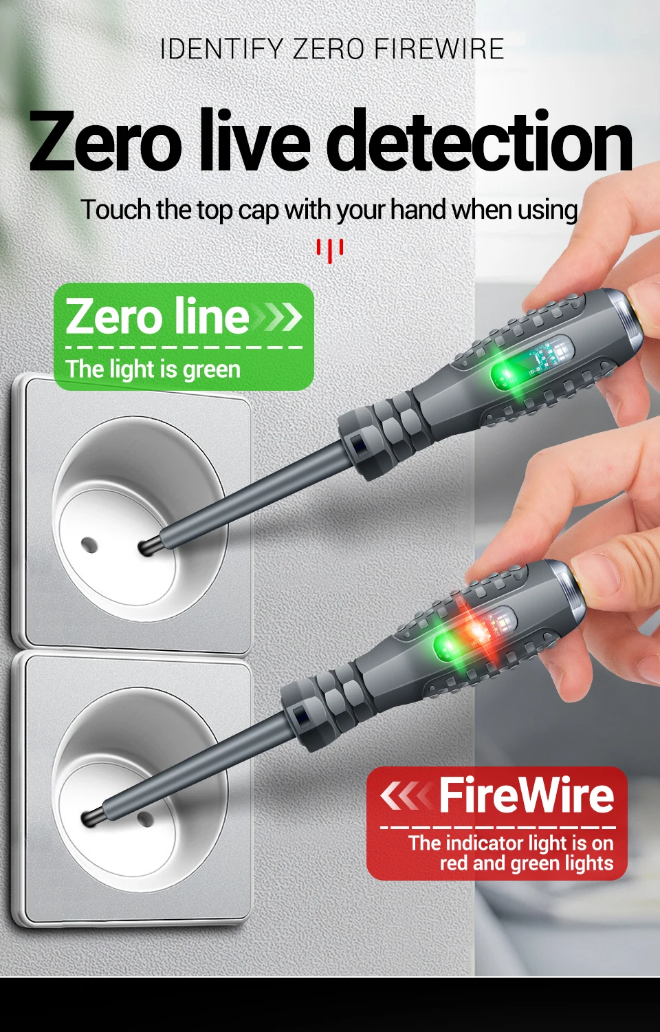 (1) Determinación de cable vivo cero: toma de prueba de tapa táctil manual, la luz verde es la línea cero y el semáforo es la línea de fuego.