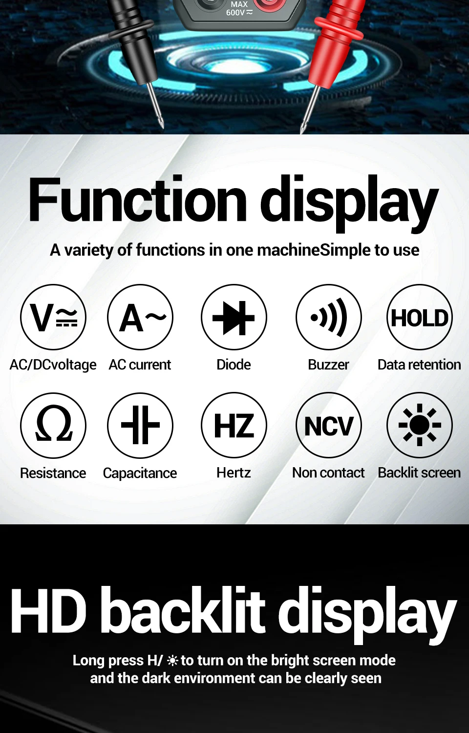 • Amplia gama de capacidades de prueba:Con la capacidad de probar voltaje CC/CA, corriente, capacitancia, NCV y resistencia de ohmios, este multímetro es una herramienta versátil para cualquier electricista.