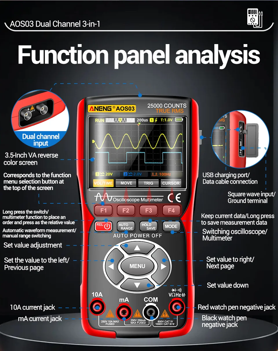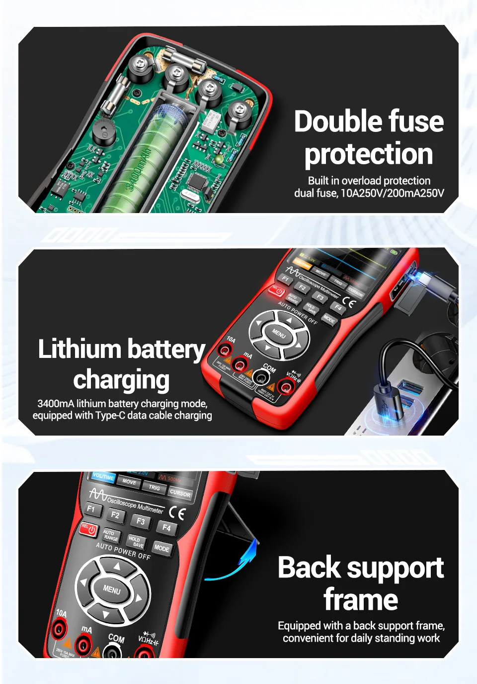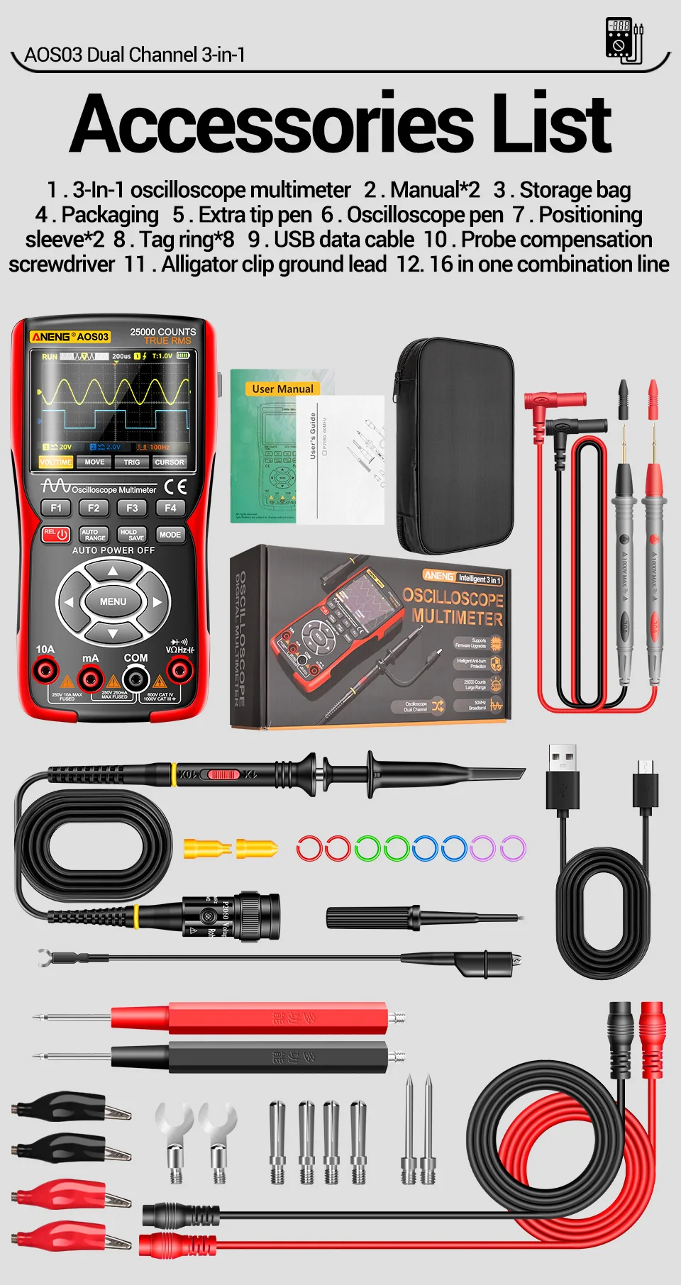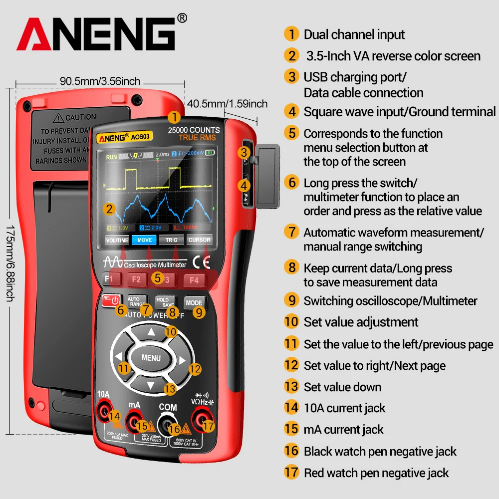 ANENG Probador de multímetro osciloscopio recargable 3 en 1 Ancho de banda de doble canal 50 MHz, muestreo 200 M/280 MSa/s Herramientas de electricista AOS03