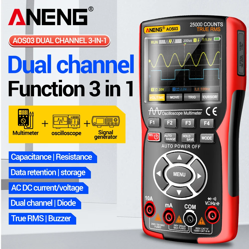 Comprar ANENG-testador multímetro de osciloscopio recargable, 3 pulgadas, 1 ancho de banda de canal dual de 50MHz, muestreo de 200M/280MSa/s, herramientas de electricista AOS03
