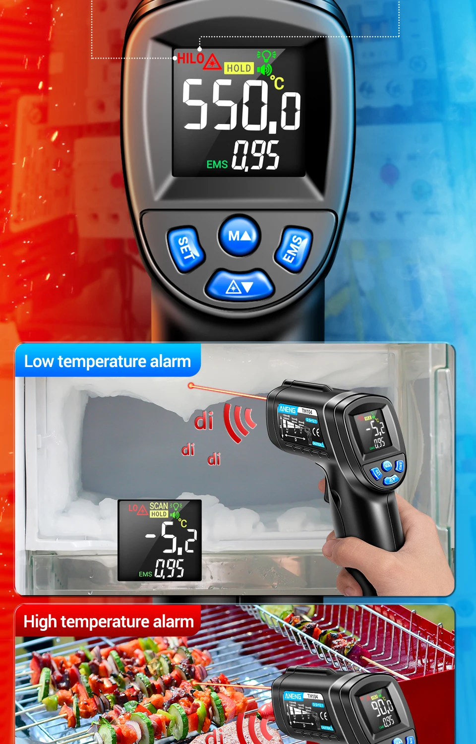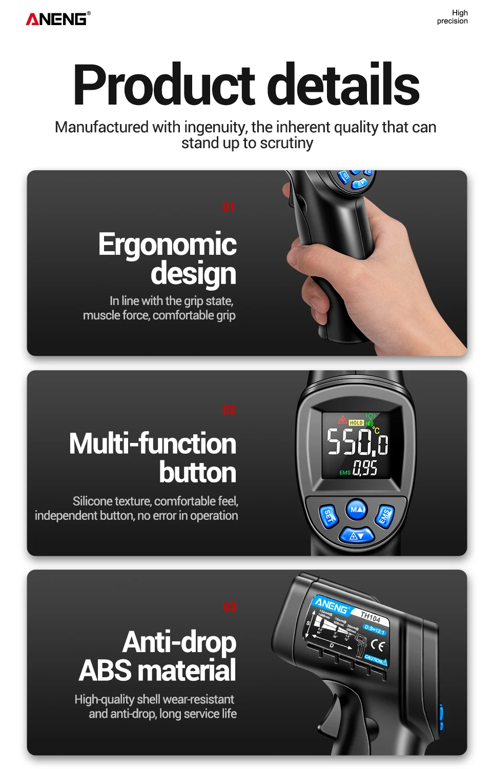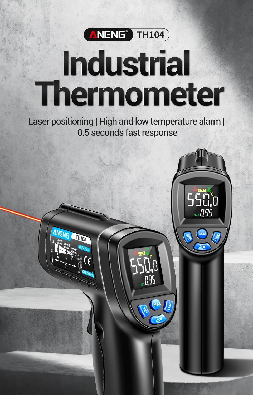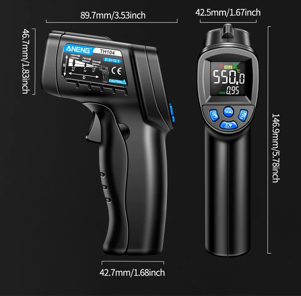 ANENG TH104 Termómetro Termohigrómetro -50~550℃ Medidor láser infrarrojo Pistola de temperatura Pantalla digital Probador sin contacto