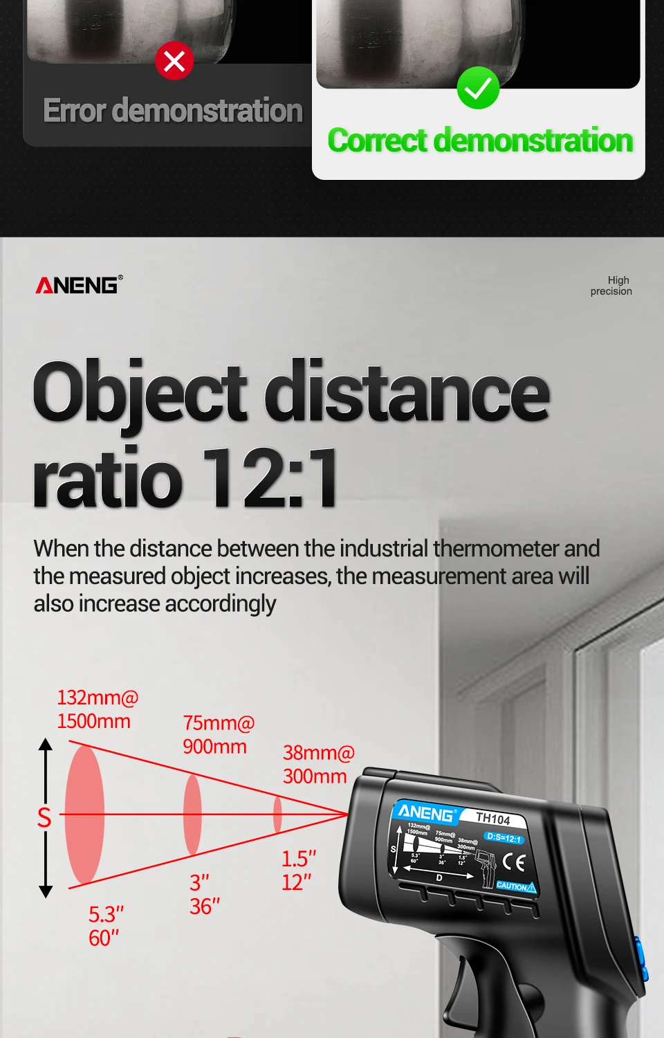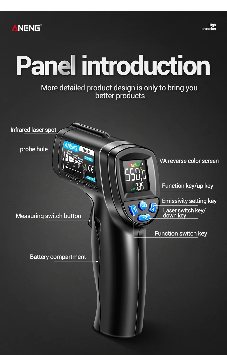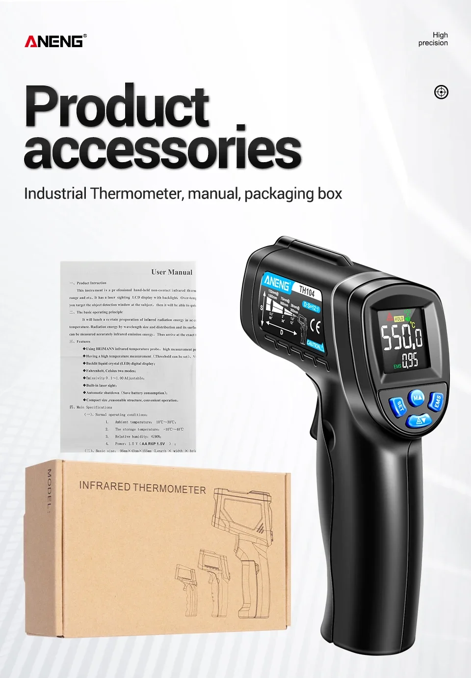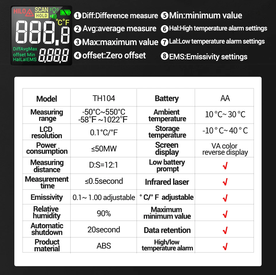 Número de modelo TH104 Batería Pila AA * 1 Rango de medición -50℃~550℃ -58℉~1022℉ Temperatura ambiente 10℃~30℃ Resolución LCD 0.1℃/°F Temperatura de almacenamiento -10℃~40℃ Consumo de energía ≤50 mw Visualización de pantalla Pantalla de visualización VA Distancia de medición D:S=12:1 Advertencia de baja corriente √ Tiempo de medición ≤0,5 segundos láser infrarrojo √ Emissividad 0,1 ~ 1,00 ajustable °C/°F ajustable √ Humedad relativa 90% Valor máximo/mínimo √ Apagado automático 20 segundos Retención de datos √ Peso 145g Advertencia de temperatura alta/baja √Paquete:(Sin batería)