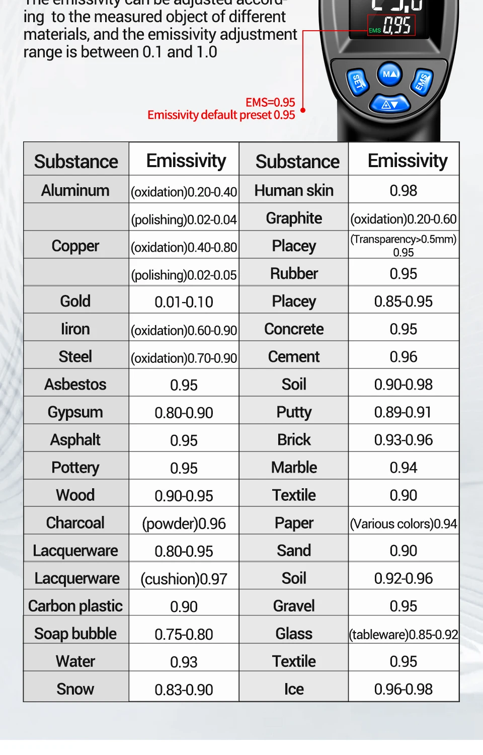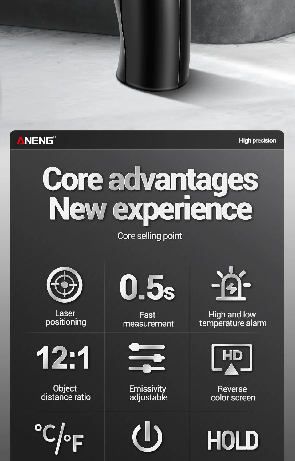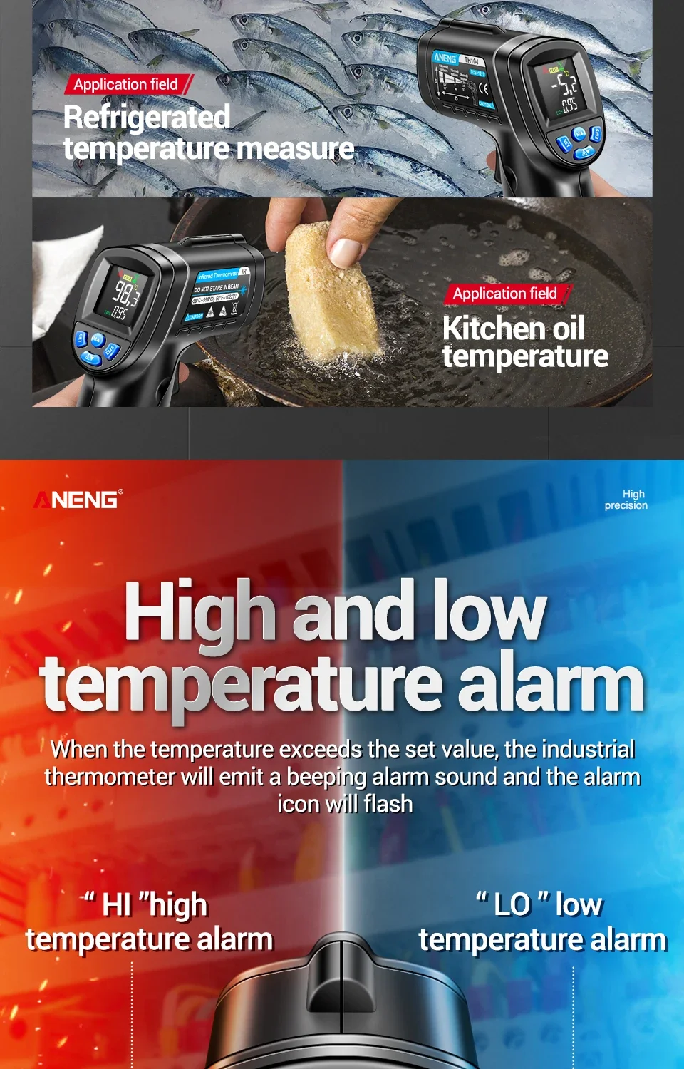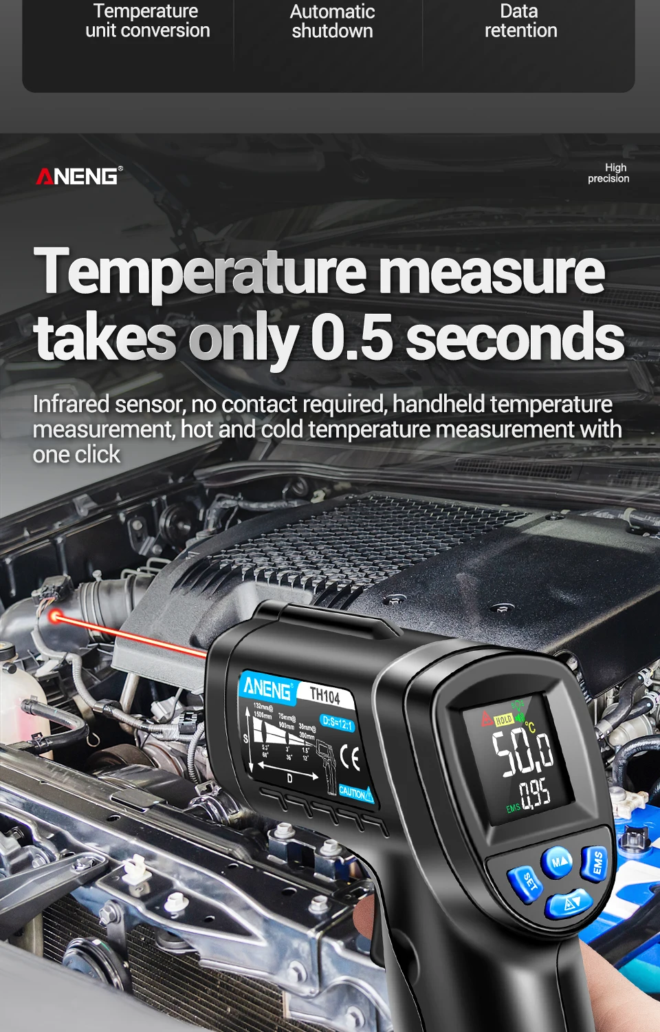 Número de modelo TH104 Batería Pila AA * 1 Rango de medición -50℃~550℃ -58℉~1022℉ Temperatura ambiente 10℃~30℃ Resolución LCD 0.1℃/°F Temperatura de almacenamiento -10℃~40℃ Consumo de energía ≤50 mw Visualización de pantalla Pantalla de visualización VA Distancia de medición D:S=12:1 Advertencia de baja corriente √ Tiempo de medición ≤0,5 segundos láser infrarrojo √ Emissividad 0,1 ~ 1,00 ajustable °C/°F ajustable √ Humedad relativa 90% Valor máximo/mínimo √ Apagado automático 20 segundos Retención de datos √ Peso 145g Advertencia de temperatura alta/baja √Paquete:(Sin batería)