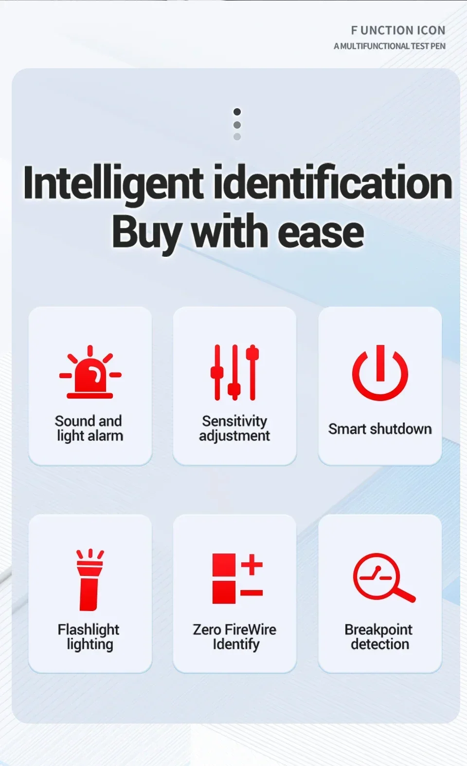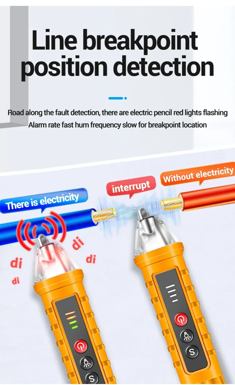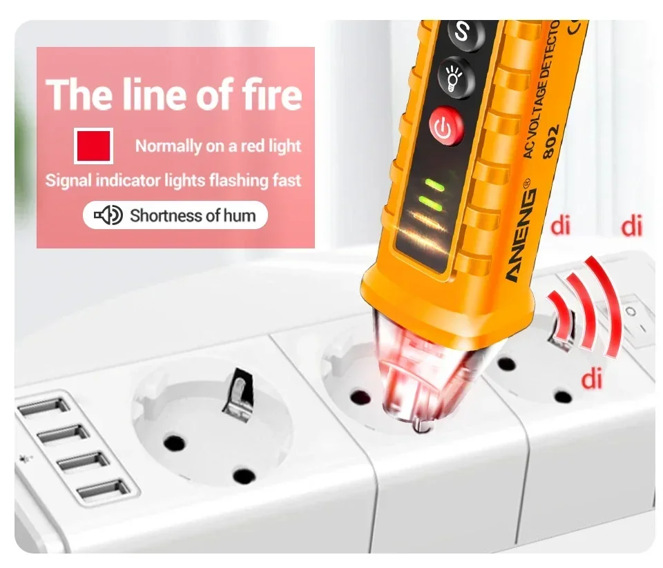 El rango de detección de voltaje de CA predeterminado de inicio del probador: aproximadamente 48〜lOOOV. Presione el botón de conmutación del rango de detección de voltaje de CA (S), el indicador del rango de detección se ilumina y el rango de voltaje detectable del probador es aproximadamente 12〜1000V. Presione el botón de cambio de rango de detección de voltaje de CA (S) nuevamente, el indicador del rango de detección se apaga y el rango de voltaje detectable del probador es aproximadamente 48〜lOOOv. 6.Función de apagado automático Cuando no se realiza ninguna operación del probador y no se detecta ninguna señal de voltaje por el probador dentro de 5 minutos, el probador se apagará automáticamente. 7. Indicación de subtensión de la batería Cuando el voltaje de la batería es inferior a aproximadamente 2,6 V, el indicador de energía parpadea 3 veces, mientras que el timbre emite un sonido y luego se apaga. Reemplace la batería oportunamente. Antes de usar, compruebe especialmente si la sonda está agrietada o rota. Si sospecha que hay un problema, envíe el probador para su reparación a tiempo. No aplique voltaje superior al voltaje nominal indicado en el probador. Al probar voltaje por encima de CA 36 V, tenga mucho cuidado para evitar el bloqueo de eletiics. Cumpla con los códigos de seguridad locales y nacionales. Utilice equipos de protección adecuados según las normas de las autoridades locales o nacionales.