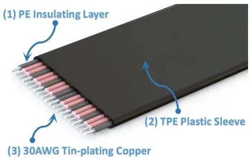 El extensor utiliza los últimos materiales para blindaje EMI con un diseño de cinco cables planos. Esta técnica permite que cada cable esté completamente cubierto por un blindaje contra interferencias electromagnéticas con polímero conductor para protegerlo contra las emisiones entrantes o salientes de frecuencias electromagnéticas, minimizar las perturbaciones y la degradación del rendimiento y reducir el peso del extensor.