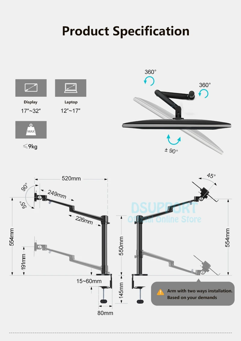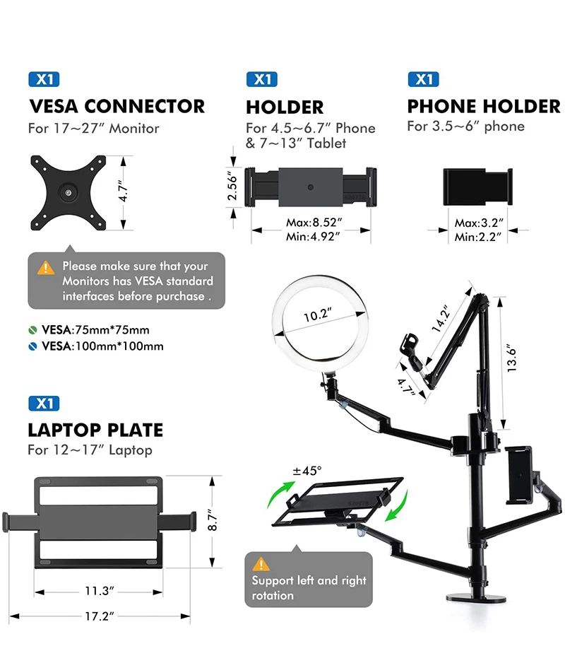Rotación del cabezal del Monitor: 360 ° inclinación del cabezal del ordenador portátil: 45 °