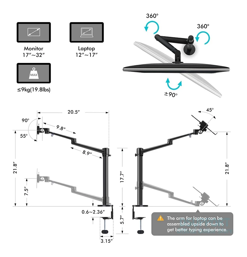 Rotación del cabezal del Monitor: 360 ° inclinación del cabezal del ordenador portátil: 45 °