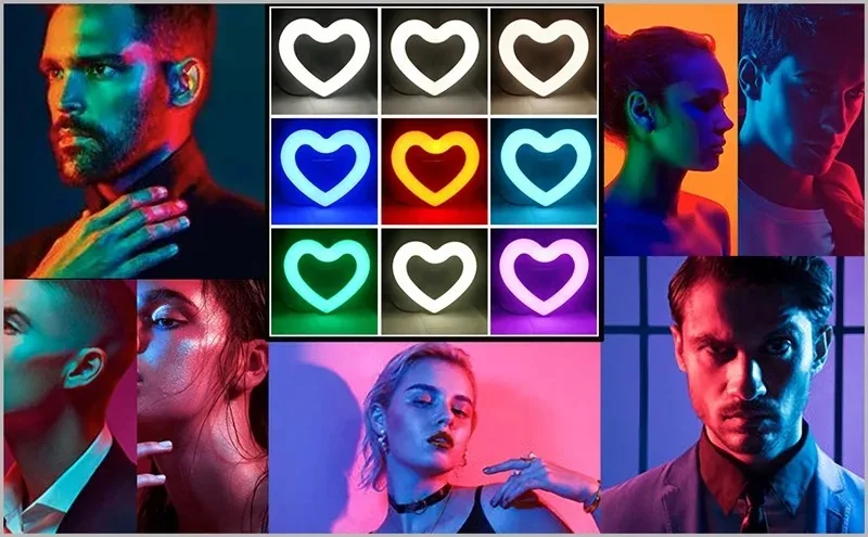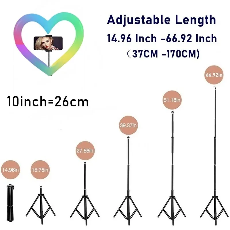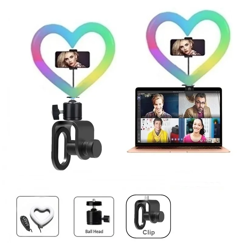 Anillo de luz para foto regulable RGB con forma de corazón de 26cm, lámpara Led para selfies, iluminación para fotografía de teléfono con soporte de trípode para vídeo de Youtube, maquillaje en vivo